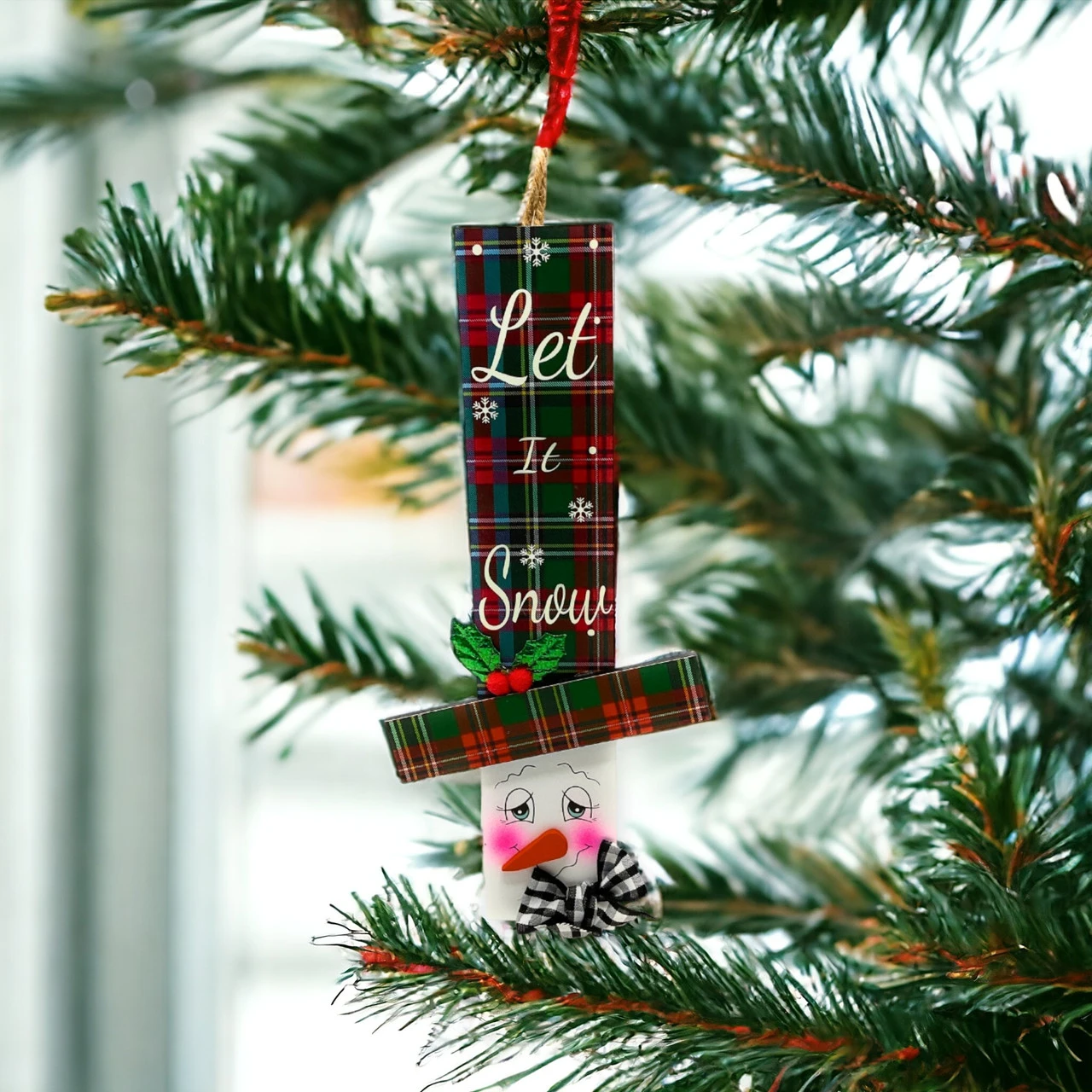 Deck your halls with the 9.5-inch Let It Snow Snowman Head Ornament, a cheery wooden piece to brighten your holiday decor and bring festive cheer.