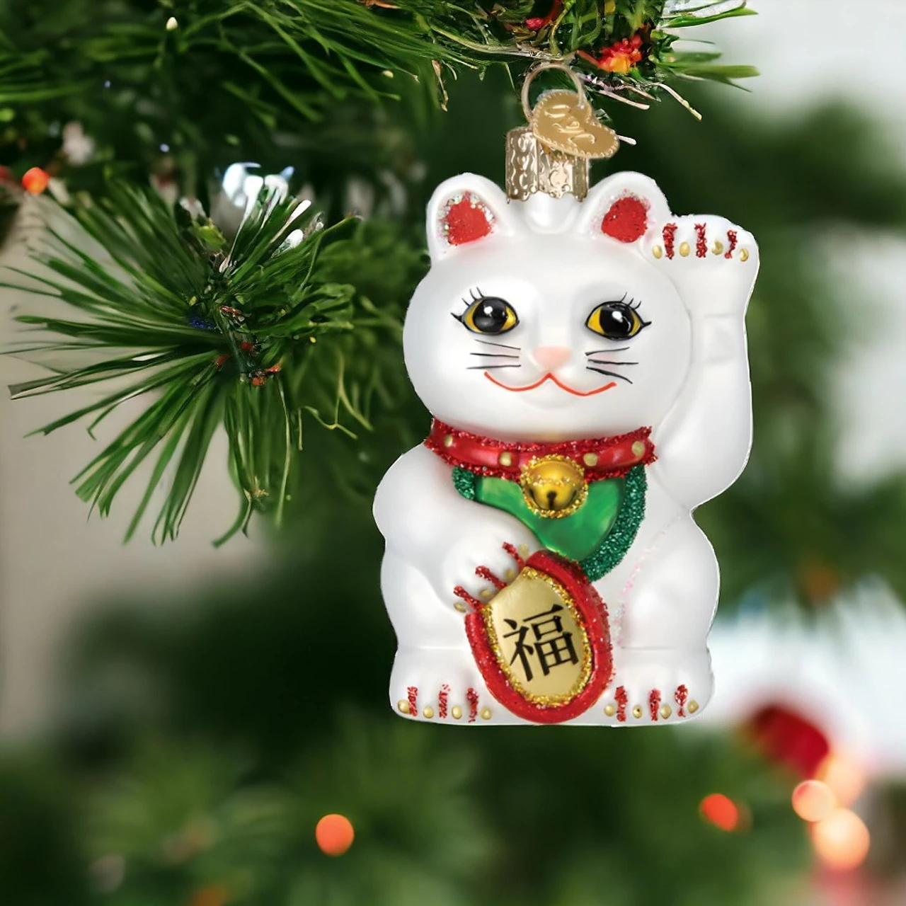 This Old World Christmas Lucky Cat Ornament adds a sprinkle of charm to your festive decor. Modeled after the traditional Japanese Maneki-neko, it promises prosperity and joy.