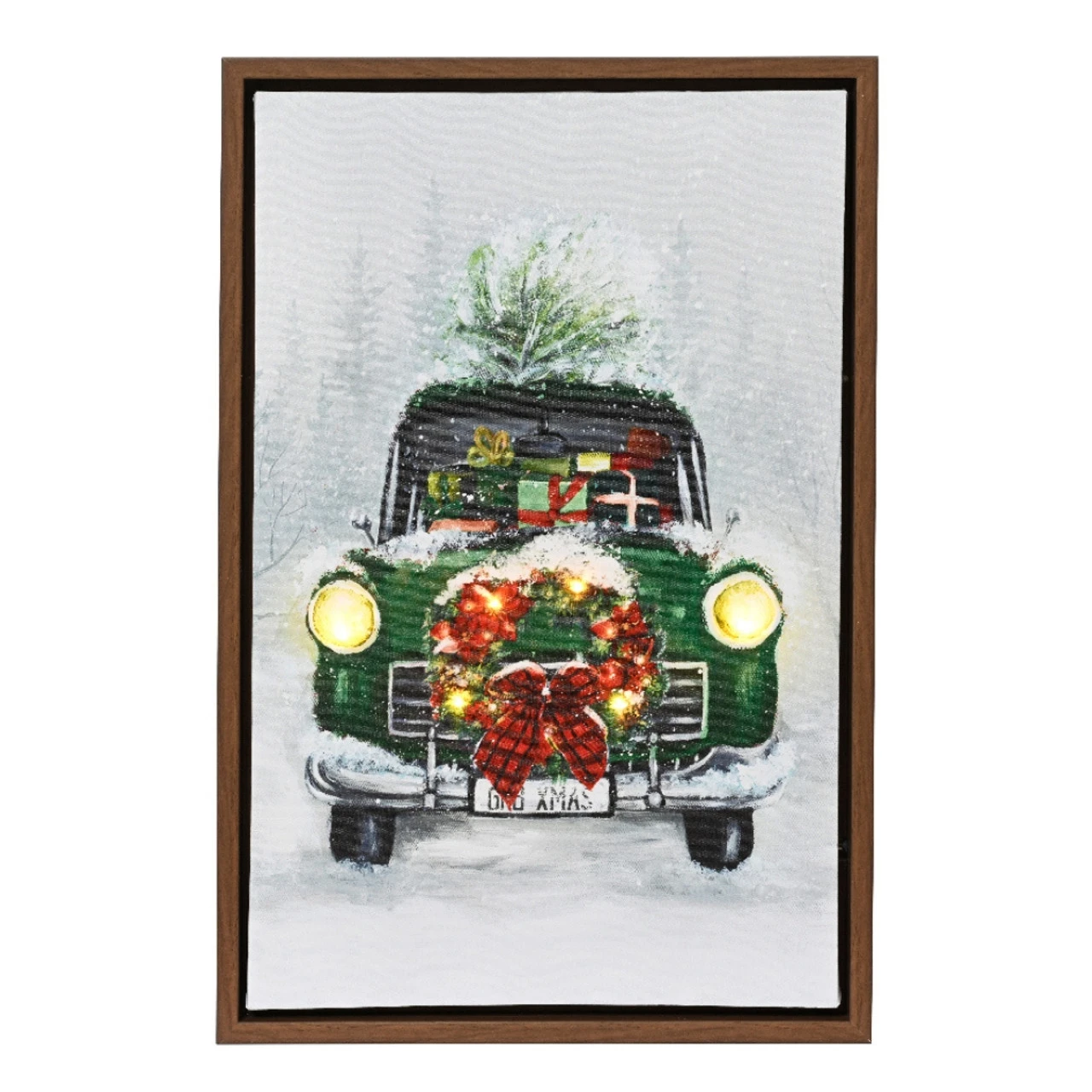 Bring the joy of the holidays to your home with the Lumineo LED Holiday Truck With Wreath Canvas. This festive 22″ x 15″ canvas captures the spirit of the season with a vintage green truck adorned with a wreath, loaded with gifts, and glowing warm white LED headlights.