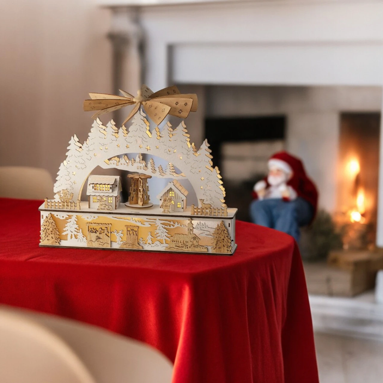 Battery operated for ease, it adds a delightful touch to any holiday display. Perfect for mantels, shelves, or as a centerpiece, this piece brings festive cheer to your home.