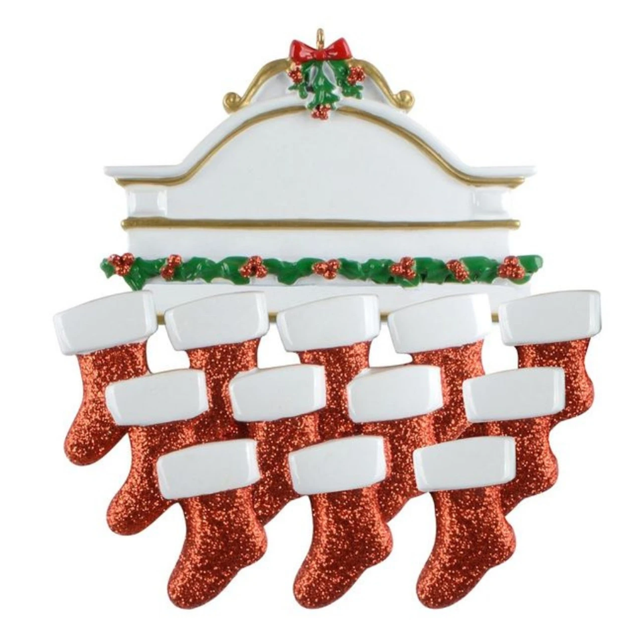 Celebrate your festive full house with our Mantle Family of 12 Personalized Ornament! This cheerful design features twelve red glittered stockings hanging with care beneath a holly-trimmed mantle. It’s perfect for large families, friend groups, or holiday crews.