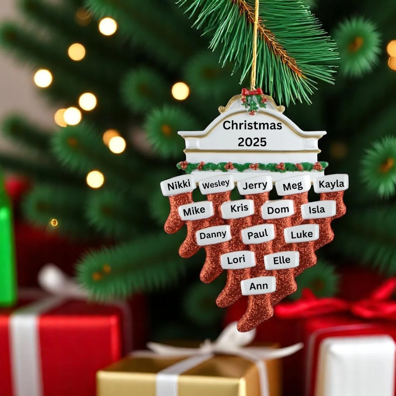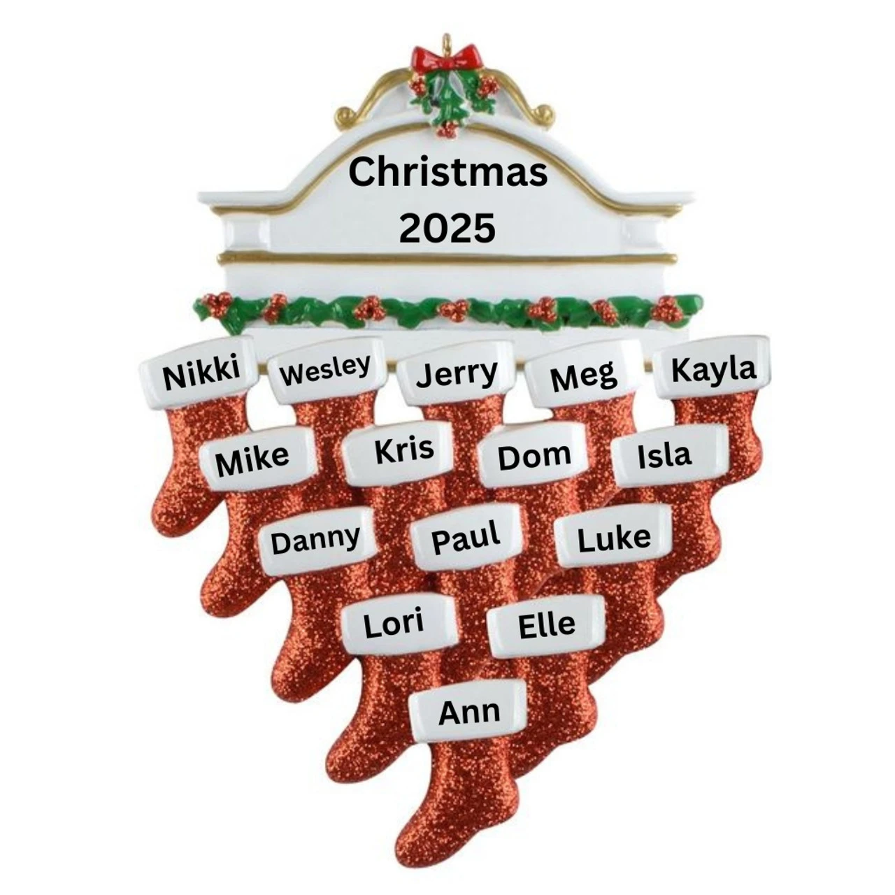 The more, the merrier! Our Mantle Family of 15 Personalized Ornament is perfect for big families or gatherings. With 15 glittering red stockings ready to be named by our skilled elves, this charming holiday piece celebrates your whole crew. Holly garland and a classic mantle set the festive tone.