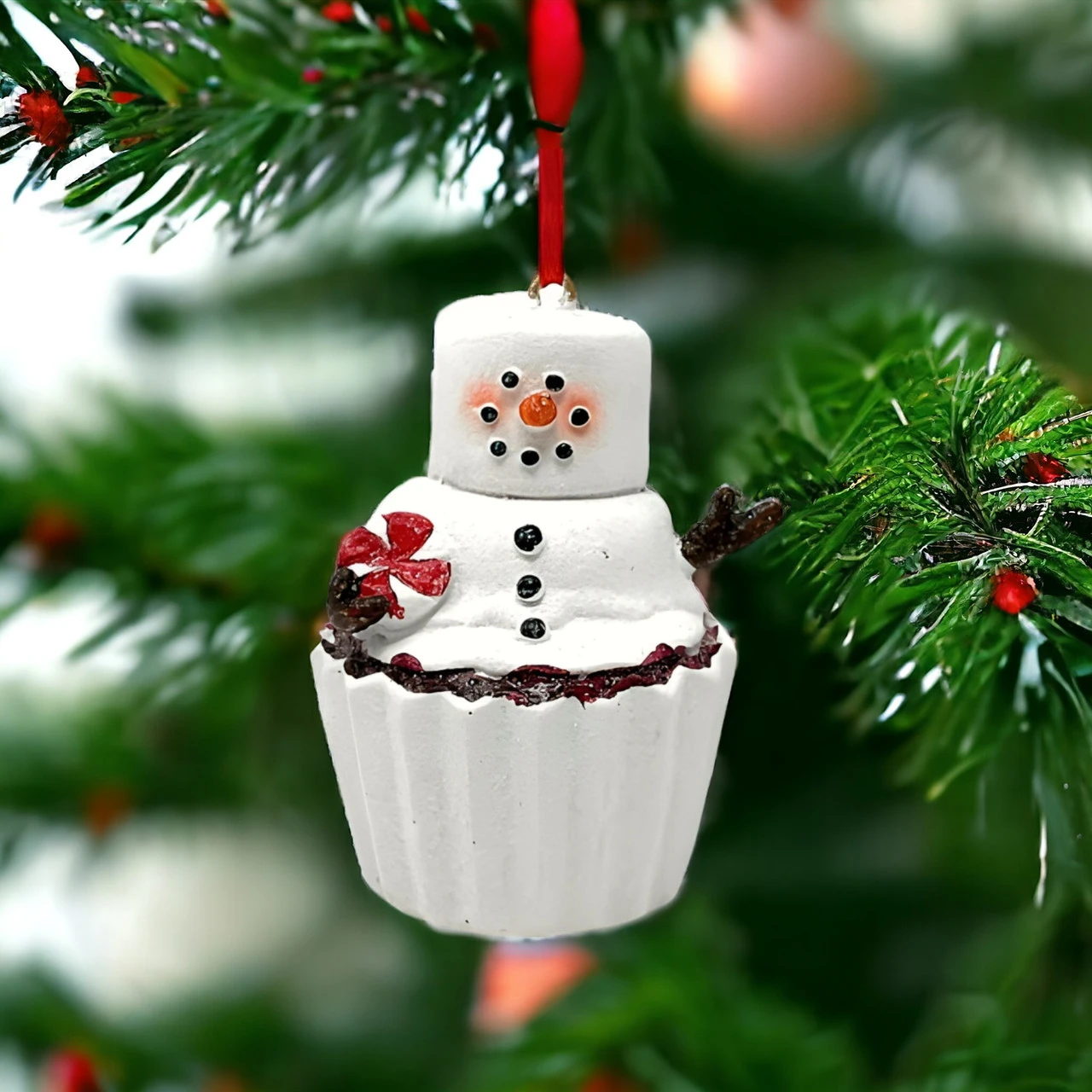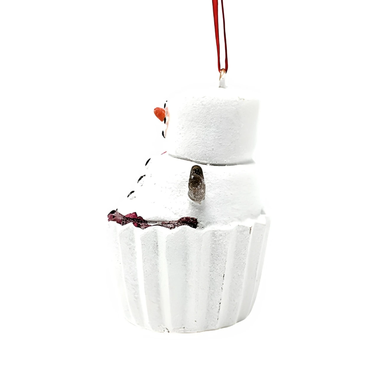 Indulge in holiday sweetness with the 3-inch Marshmallow Snowman Cupcake Ornament, a resin treat that brings festive whimsy to your Christmas decor.
