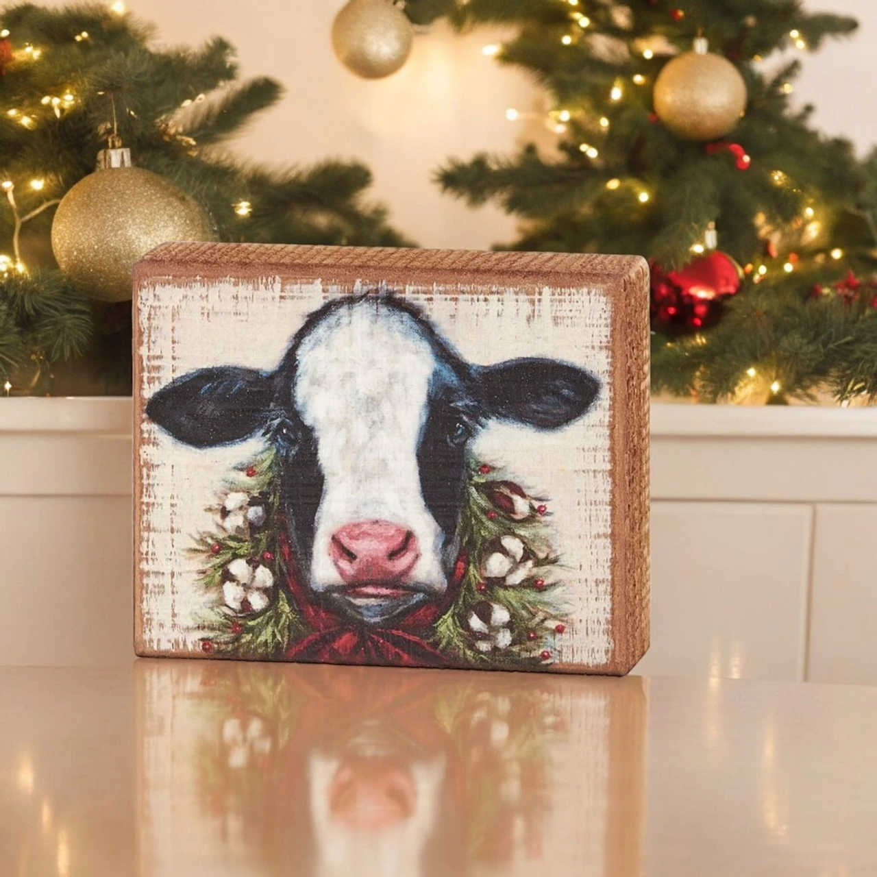 Bring rustic charm to your holiday decor with this Merry Calf Block Sign. Featuring a beautifully detailed image of a calf adorned with a festive wreath, this wooden block sign is perfect for adding a cozy, farmhouse touch to your home.
