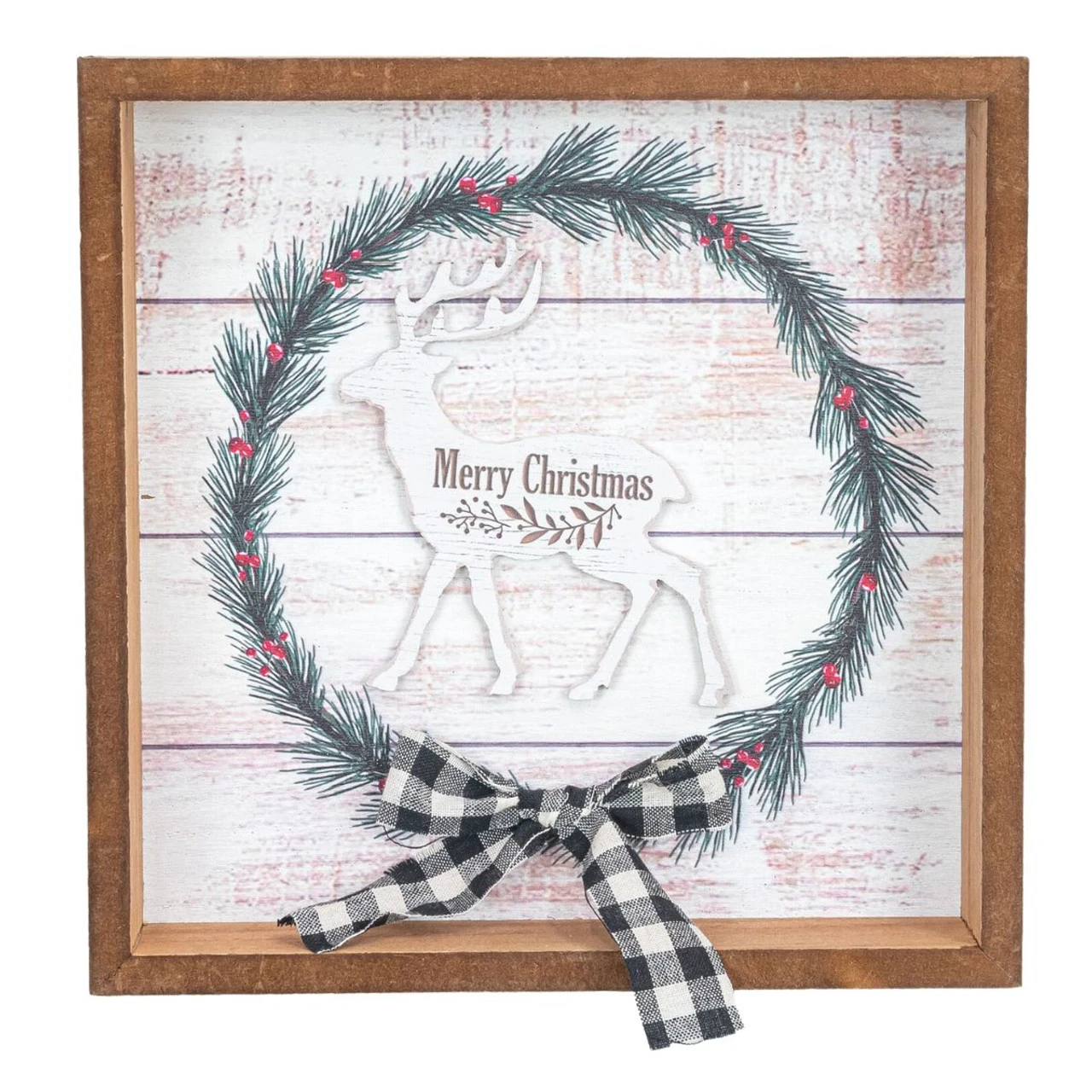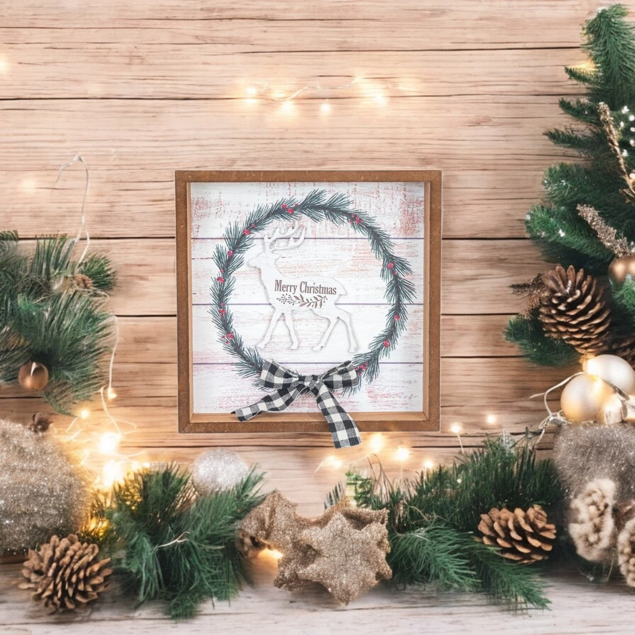 Embrace rustic charm with this Merry Christmas White Wreath Block. Featuring a cozy woodland deer silhouette framed by a pine wreath and accented with a classic black-and-white buffalo plaid bow, this 8×8 inch block is the perfect blend of farmhouse and festive.