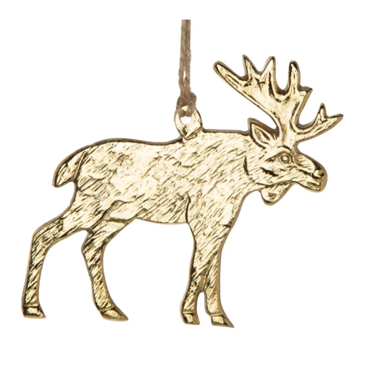 Add a touch of rustic elegance to your holiday decor with this metal moose ornament in a shimmering gold tone. Featuring intricate details and a classic silhouette, it’s perfect for nature-themed trees or as a unique decorative accent.