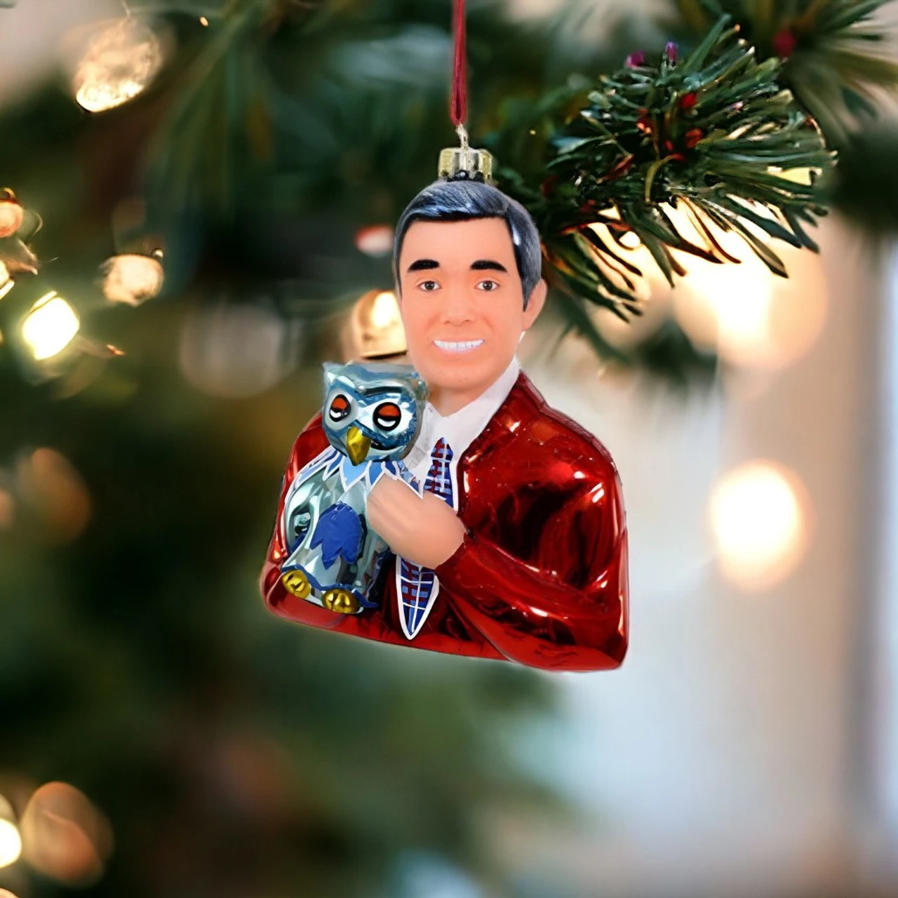Cody Foster’s Mister Rogers – Red ornament is a nostalgic nod in resin. Sporting his classic red blazer and a friendly owl companion, this piece exudes warmth and beloved memories.