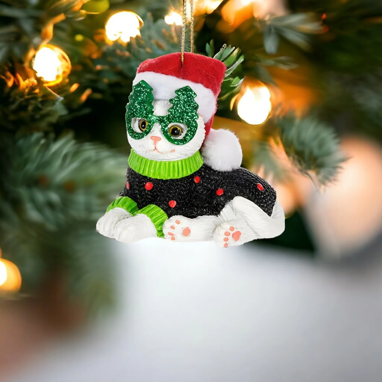 Add a touch of quirky charm to your Christmas decor with our Navidad Cat with Green Tree Glasses Ornament! This adorable cat ornament features sparkling green glasses shaped like Christmas trees, a festive red Santa hat, and a cozy black sweater with red polka dots.