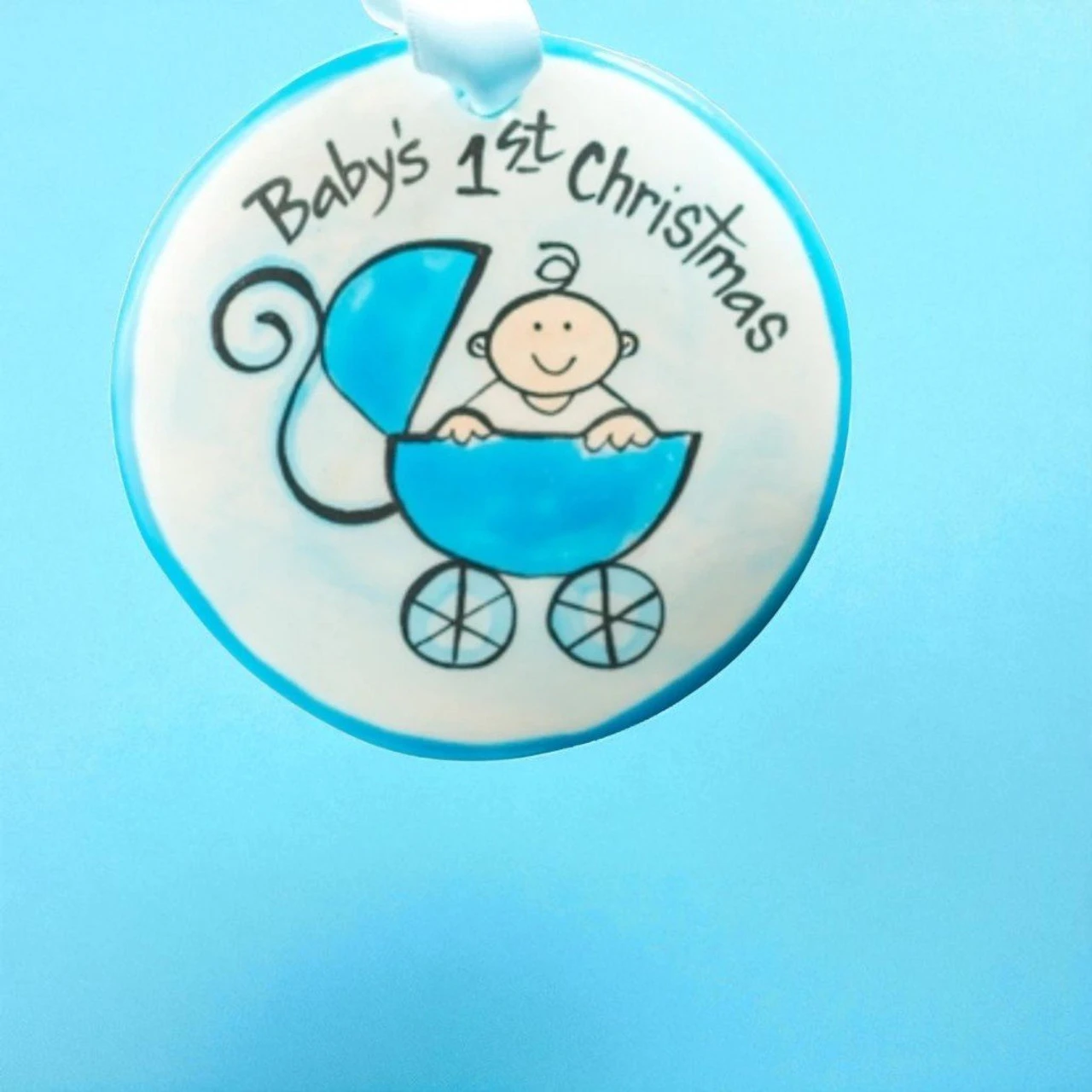 Celebrate a precious milestone with the Nola Watkins Baby’s First Christmas Ornament, hand-painted in Halifax, VA. This sweet ceramic disk features a smiling baby in a bright blue stroller with the words “Baby’s 1st Christmas.”