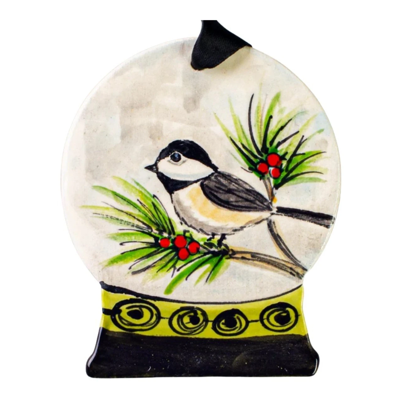 Bring the beauty of nature indoors with the Nola Watkins Chickadee Snow Globe Ornament, hand-painted in Halifax, VA. This ceramic ornament features a delicate chickadee perched on a pine branch accented with festive holly berries. Each ornament is individually hand-painted, ensuring every piece is a unique work of art.