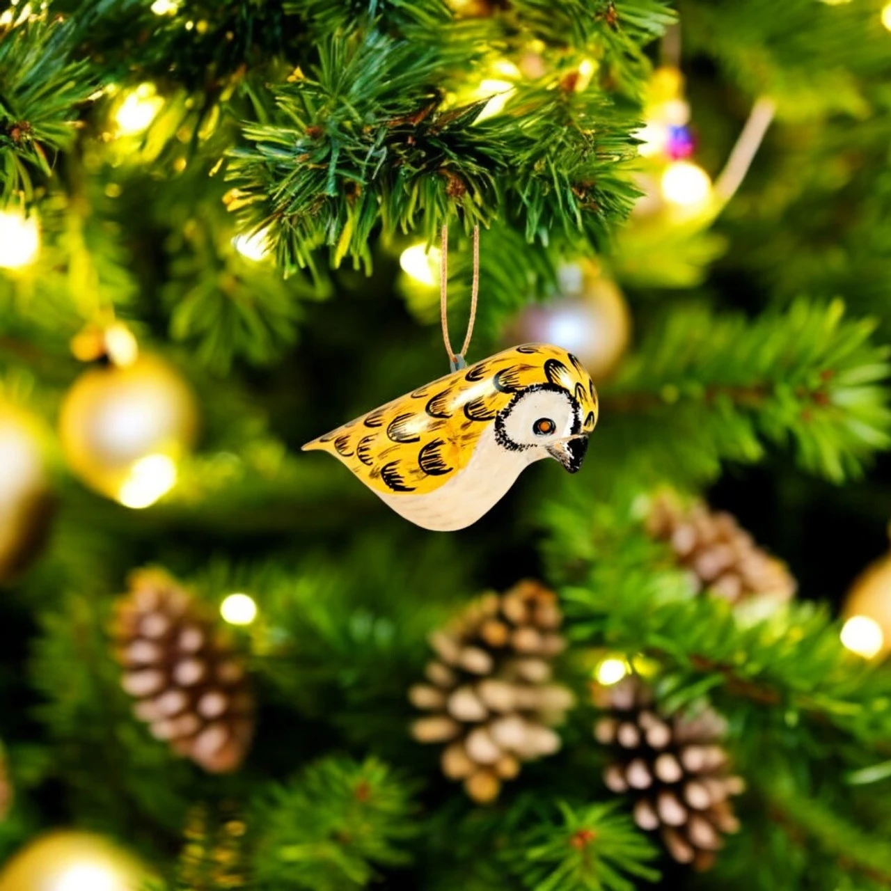 Add a touch of wisdom to your decor with this Hand-Carved Owl Wood Bird Ornament. Painted in charming shades of yellow and black, this 4-inch ornament captures the essence of an owl, perfect for nature lovers.