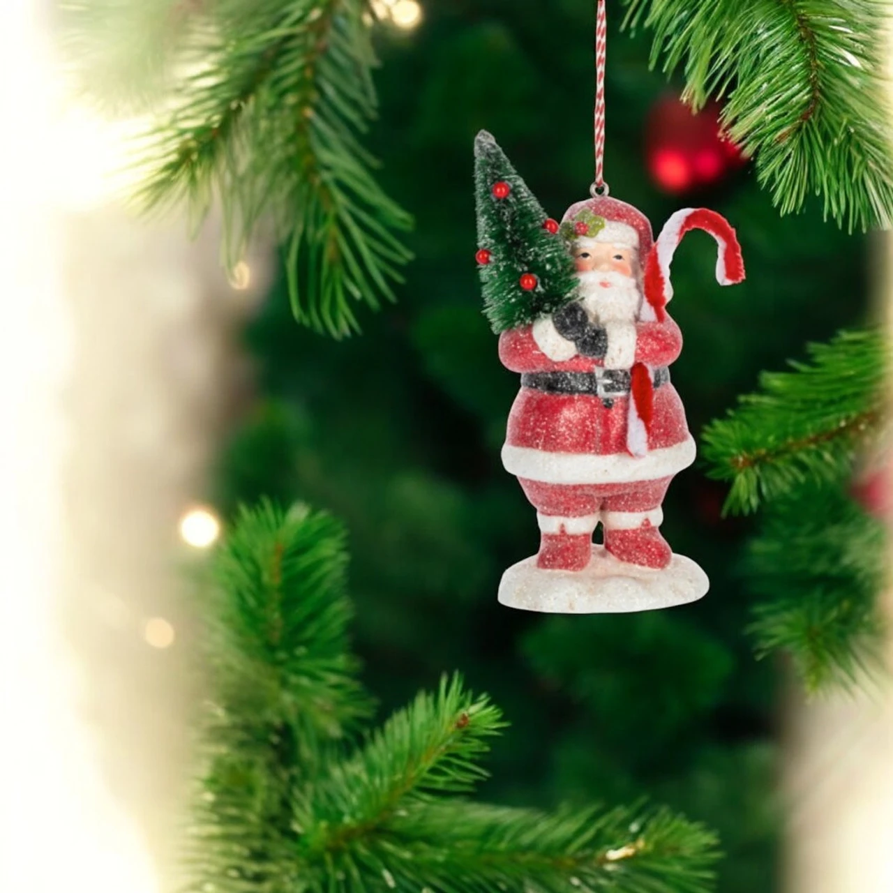 Capture the magic of yesteryear with our Paper Santa with Tree Ornament! Santa is bundled up in a classic red suit, carrying a festive mini Christmas tree and a cheerful candy cane. Lightly dusted with glitter, this vintage-style ornament is crafted from lightweight paper and stands 4.25 inches tall and 2.25 inches wide.