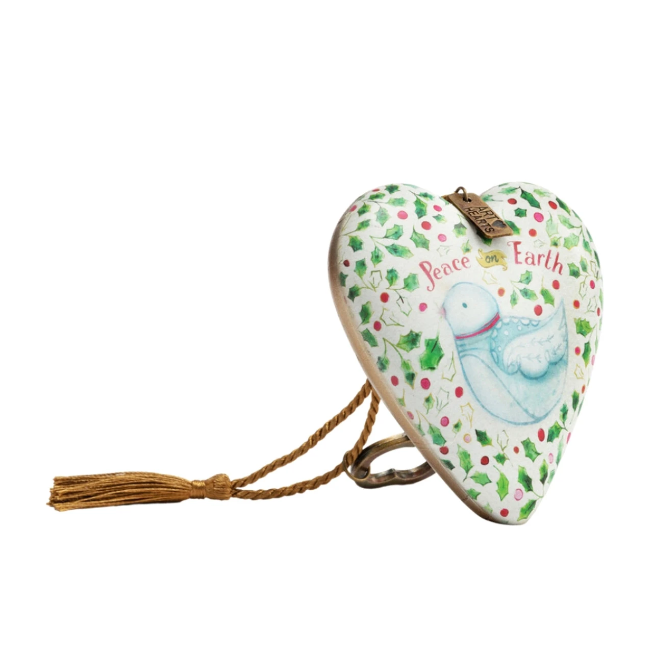 Experience the tranquility of the season with the Peace Dove Art Heart Sculpture. Crafted in a unique heart silhouette with a vintage brass key and golden rope, this piece elegantly features a serene dove amidst holly berries, symbolizing universal harmony with the message, “Peace On Earth.” A special item in our Art Hearts Collection, this sculpture infuses any space with a sense of peace, making it an ideal holiday gift that resonates with timeless wishes for global unity and joyous spirit.