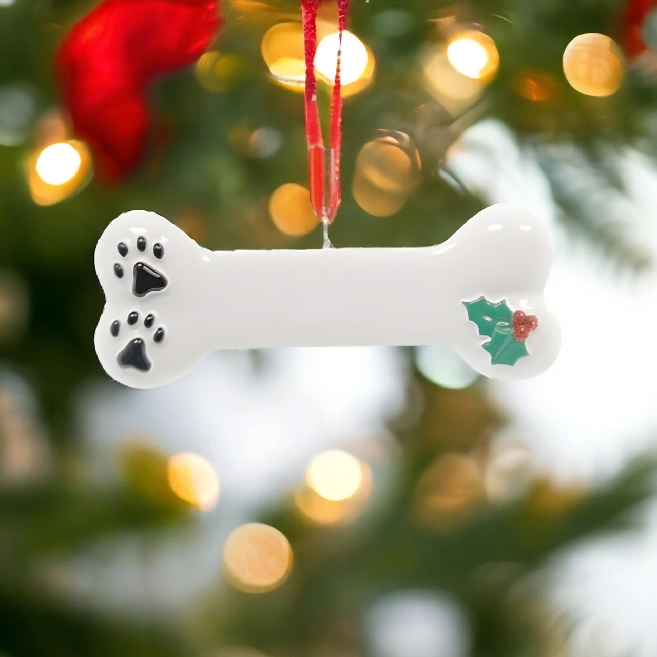 Honor your furry friend with our Personalizable Dog Bone Ornament. This ceramic bone, detailed with paw prints and holly, awaits your pet’s name. It’s a heartwarming addition to your holiday trimmings that celebrates the paw prints left on your heart. Durable and delightful, it’s perfect for pet parents wanting to include their cherished companions in the most festive way!