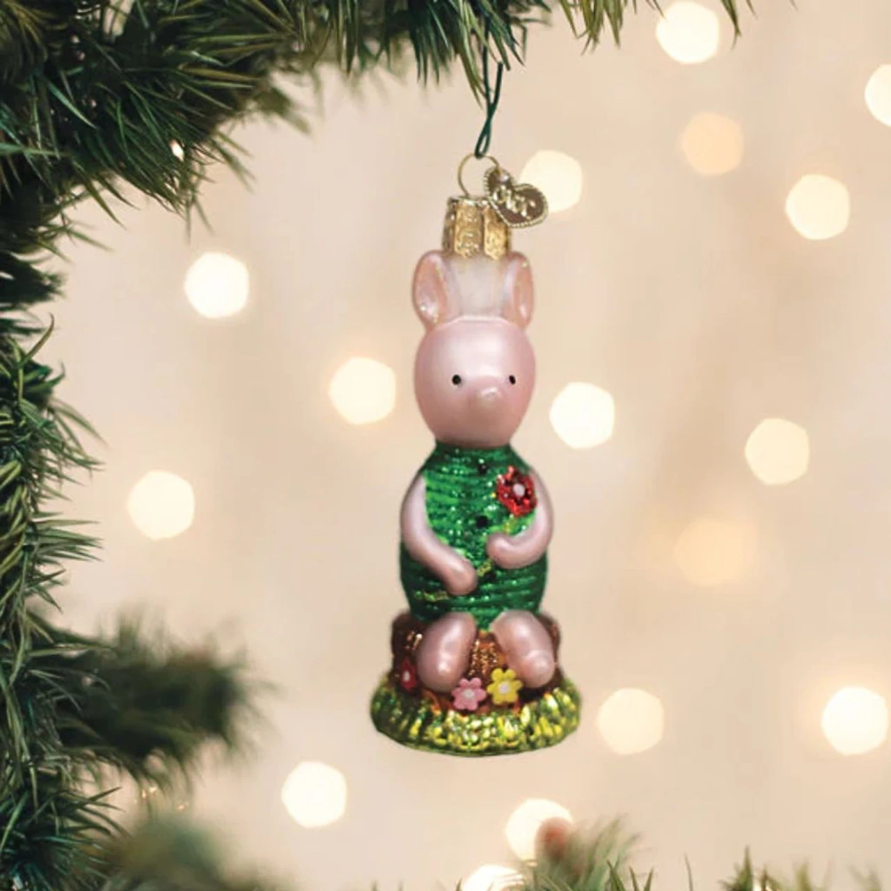 Add a touch of charm to your holiday decor with this Piglet Glass Ornament by Old World Christmas! Handcrafted from blown glass and hand-painted with delicate details, this adorable piglet features a green striped outfit, a floral accent, and a glittery finish.
