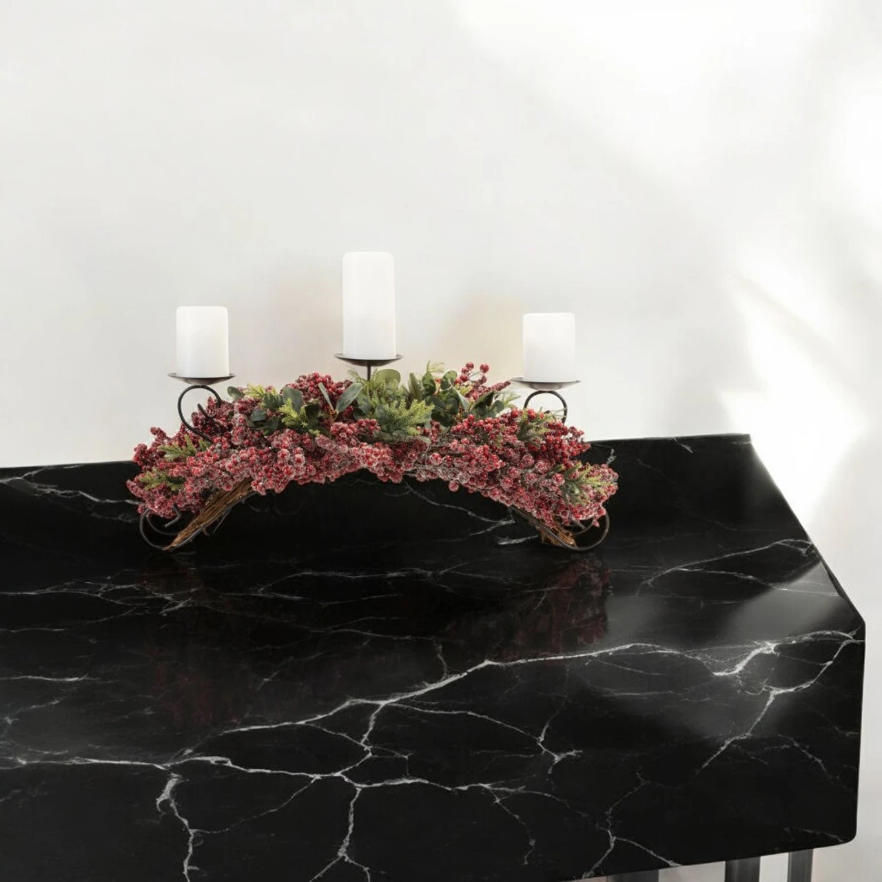 Create a warm and inviting holiday display with this Pine and Berry Candle Centerpiece. Measuring 31 inches long and 11 inches high, this festive arrangement features frosted red berries, pine greenery, and three elegant candle holders.