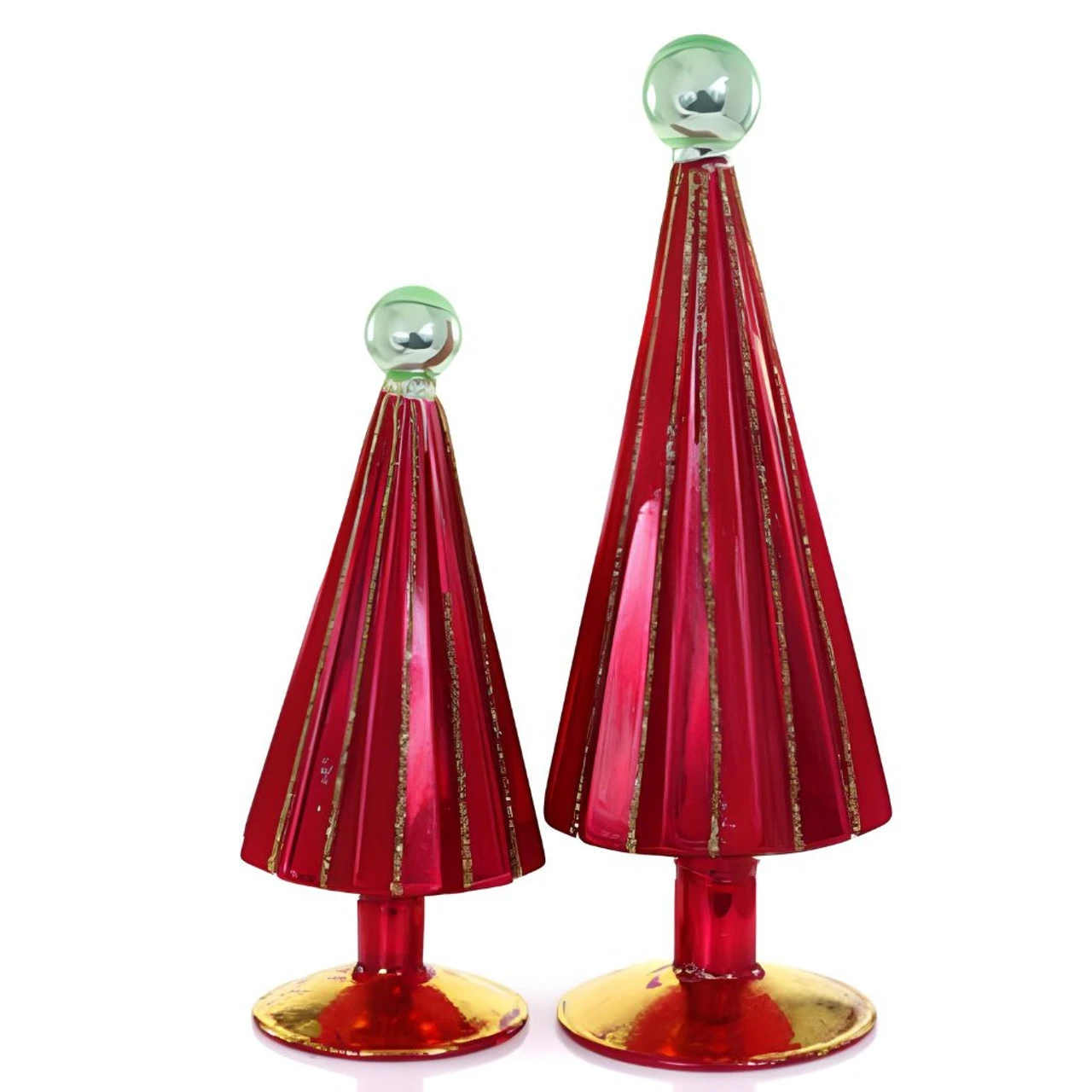Add a burst of festive color to your holiday decor with Cody Foster’s “Pleated Tree Small Red Green Set.” This striking pair features glossy red trees with golden glitter accents and a chic green glass orb crowning each top.