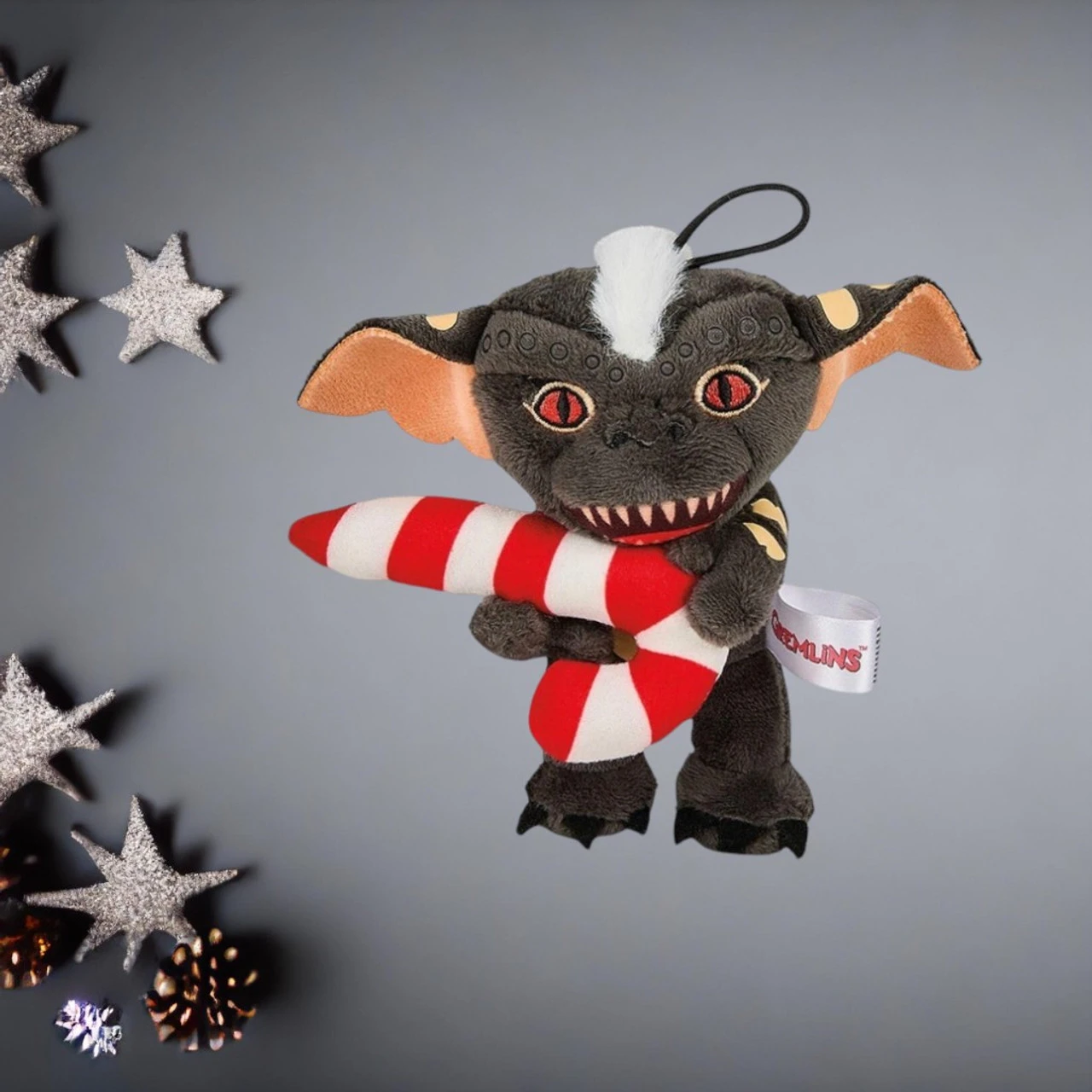 Bring some mischievous fun to your holiday decor with the Plush Gremlins Stripe With Candy Cane Ornament. Made from soft polyester, this 6.5-inch ornament features Stripe, the leader of The First Batch from the Gremlins movie.