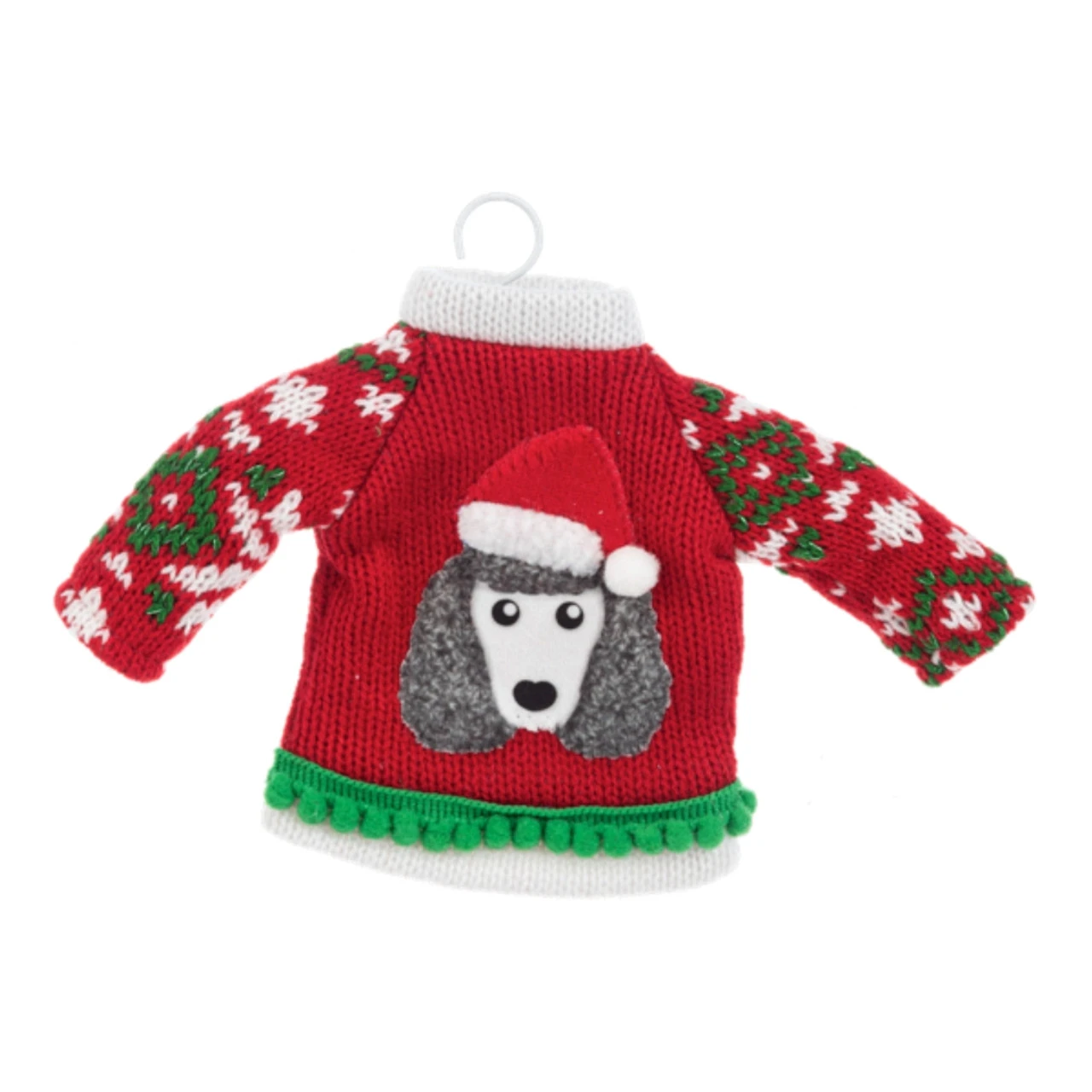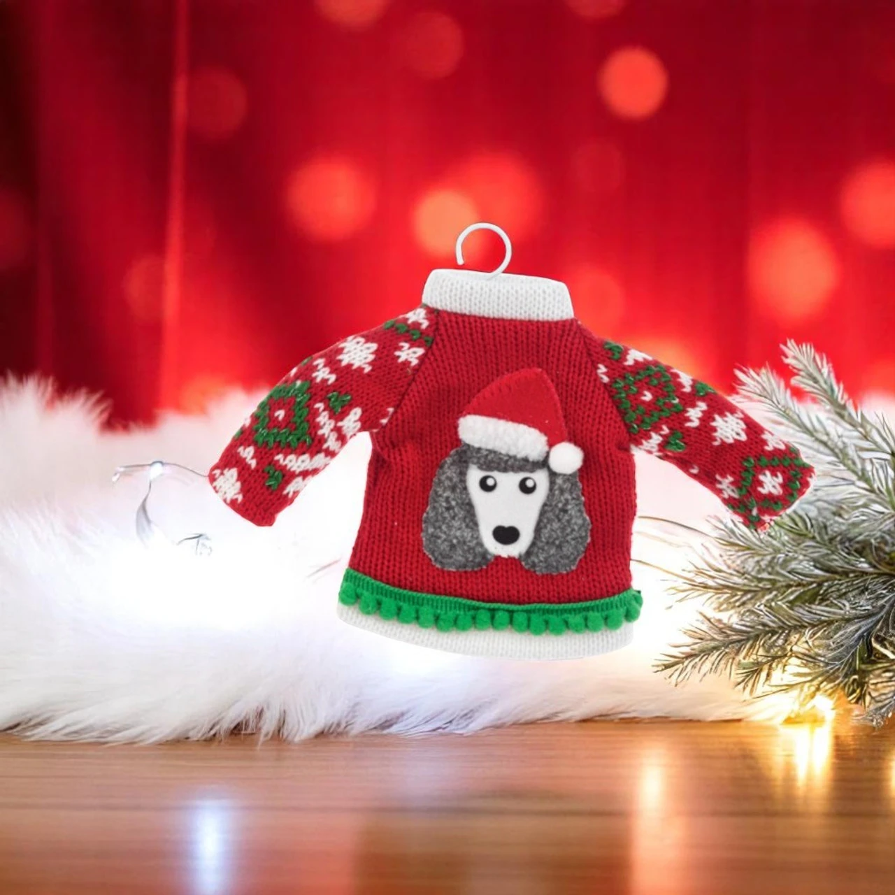 Add a cozy splash of canine charm to your tree with this Poodle Holiday Sweater Ornament! Measuring 5.5″ tall and 7.75″ wide, this festive knit ornament features a red and green sweater decked out in holiday patterns and a sweet poodle face wearing a Santa hat. Made of soft polyester with adorable pom-pom trim, it’s the perfect gift for dog lovers or anyone who appreciates a good ugly Christmas sweater moment—no shedding required!