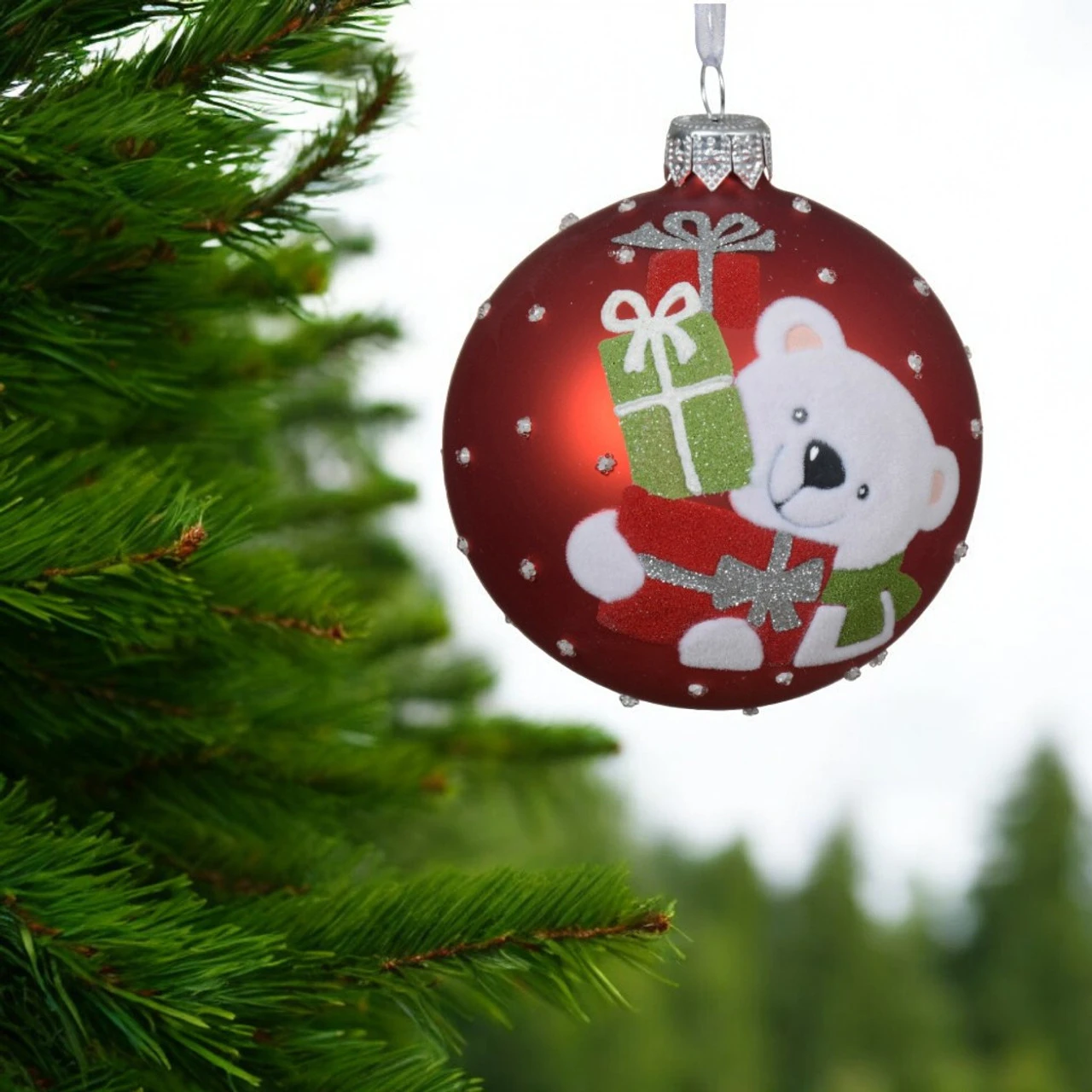 Add a touch of whimsy to your holiday decor with this charming red glass ornament featuring an adorable polar bear holding gifts. Measuring 3 inches in diameter, this delightful ornament is made of high-quality glass and is perfect for adding a festive flair to your Christmas tree. Its vibrant colors and playful design will bring joy and cheer to your holiday celebrations. Easy to hang, it’s a must-have for your ornament collection.
