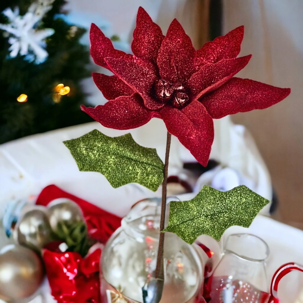 Add sparkle to your holiday decor with this 16-inch Red Poinsettia Pick. Featuring vibrant red petals with a glittery finish and lush green leaves, this pick is perfect for wreaths, garlands, or standalone arrangements.