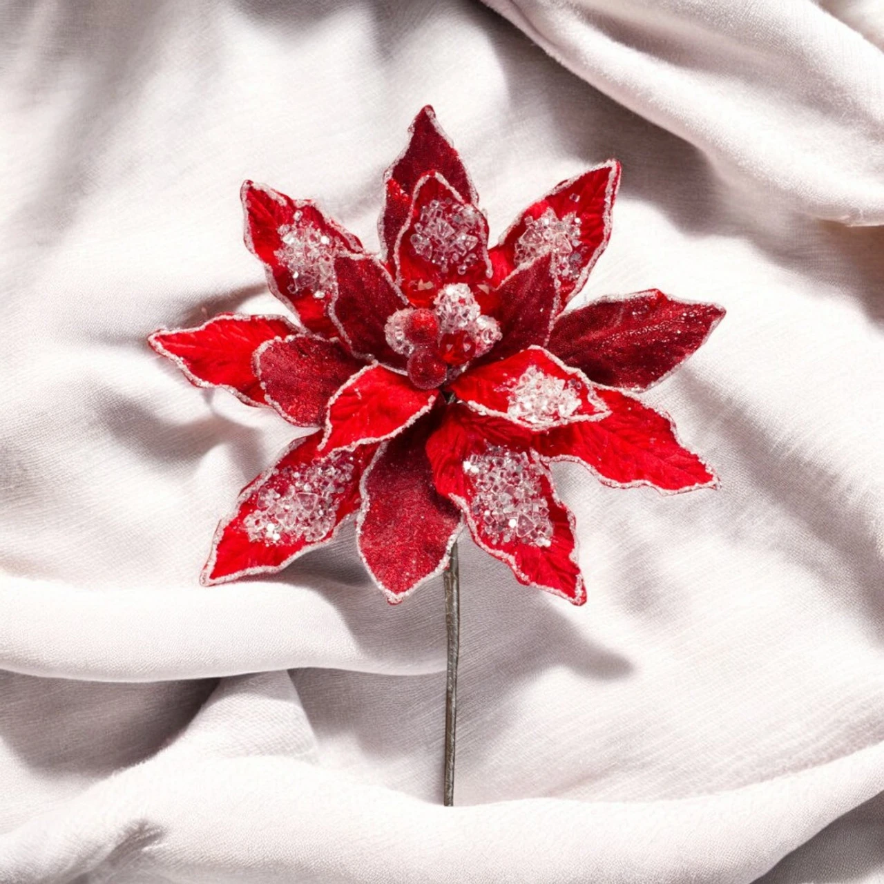 Perfect for incorporating into wreaths, garlands, or Christmas tree arrangements, this poinsettia brings a vibrant and classic holiday feel to your decorations. Make your holiday displays stand out with this stunning, glittering floral addition.