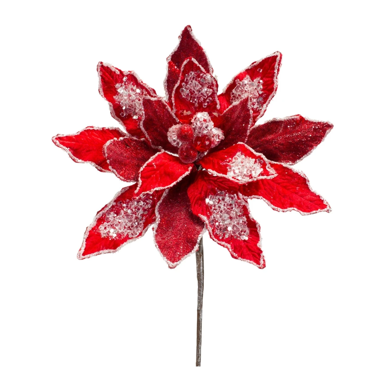 Add a bold touch to your holiday decor with this Red Velvet Poinsettia Stem. Standing 30 inches tall, this elegant stem features velvety red petals accented with sparkling glitter and frosted details, creating a luxurious and festive look.