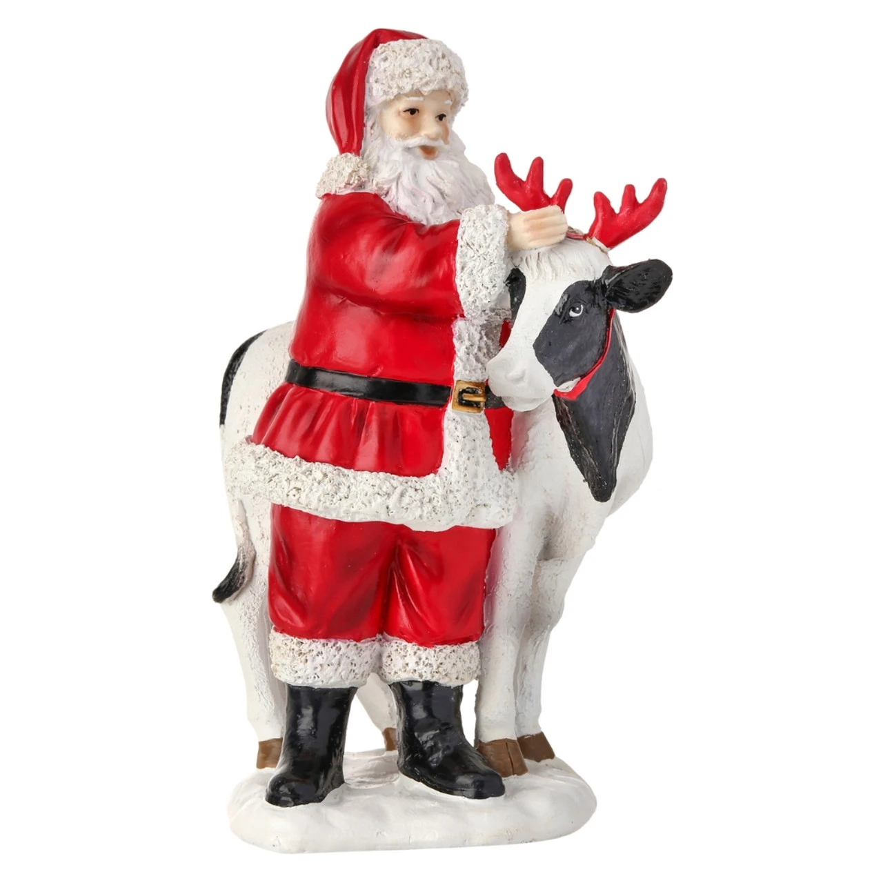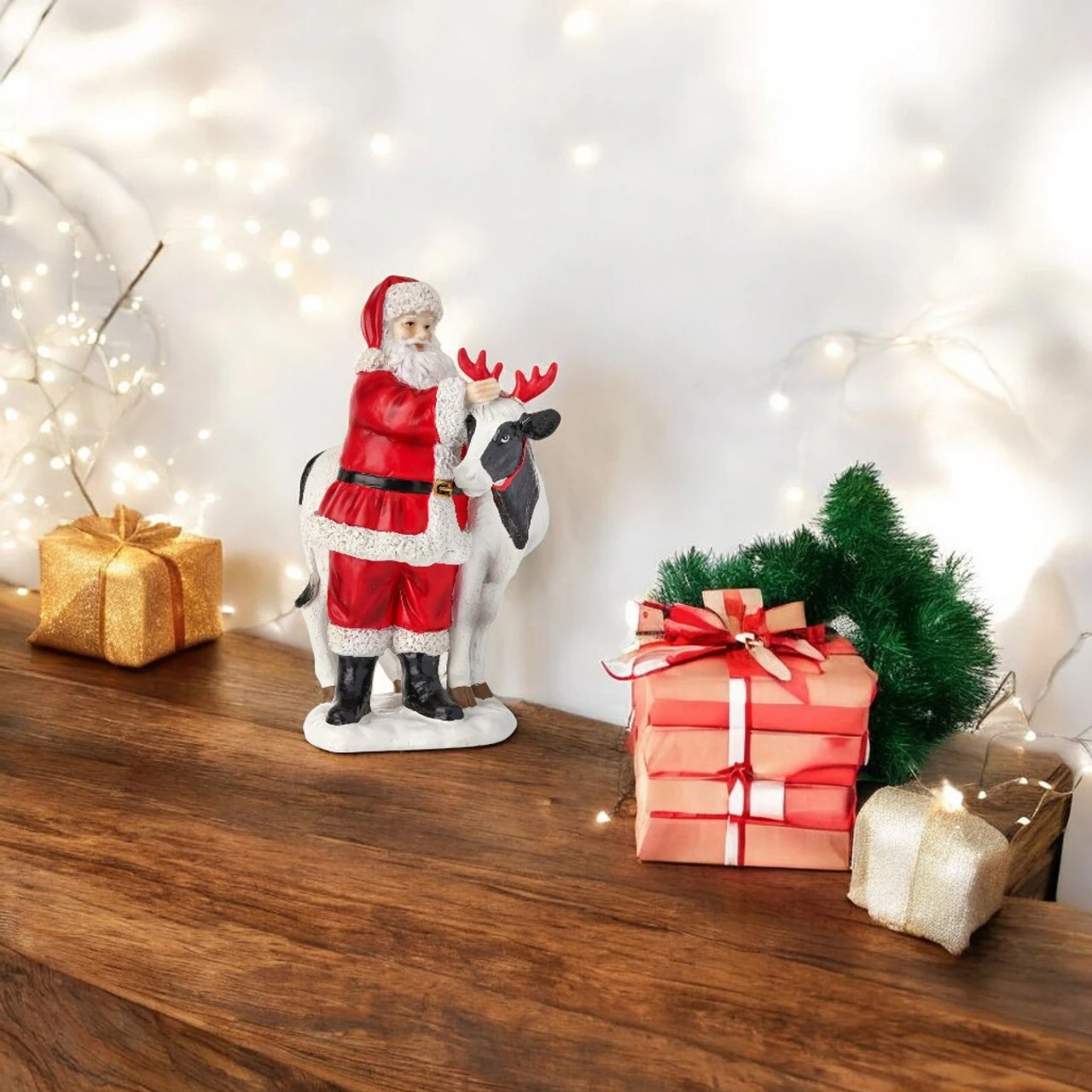 Bring a touch of whimsy to your holiday decor with this 8.5″ Resin Santa with Cow Figurine. Santa, dressed in his classic red suit, is playfully adorning a friendly cow with reindeer antlers, creating a delightful scene that will warm hearts.