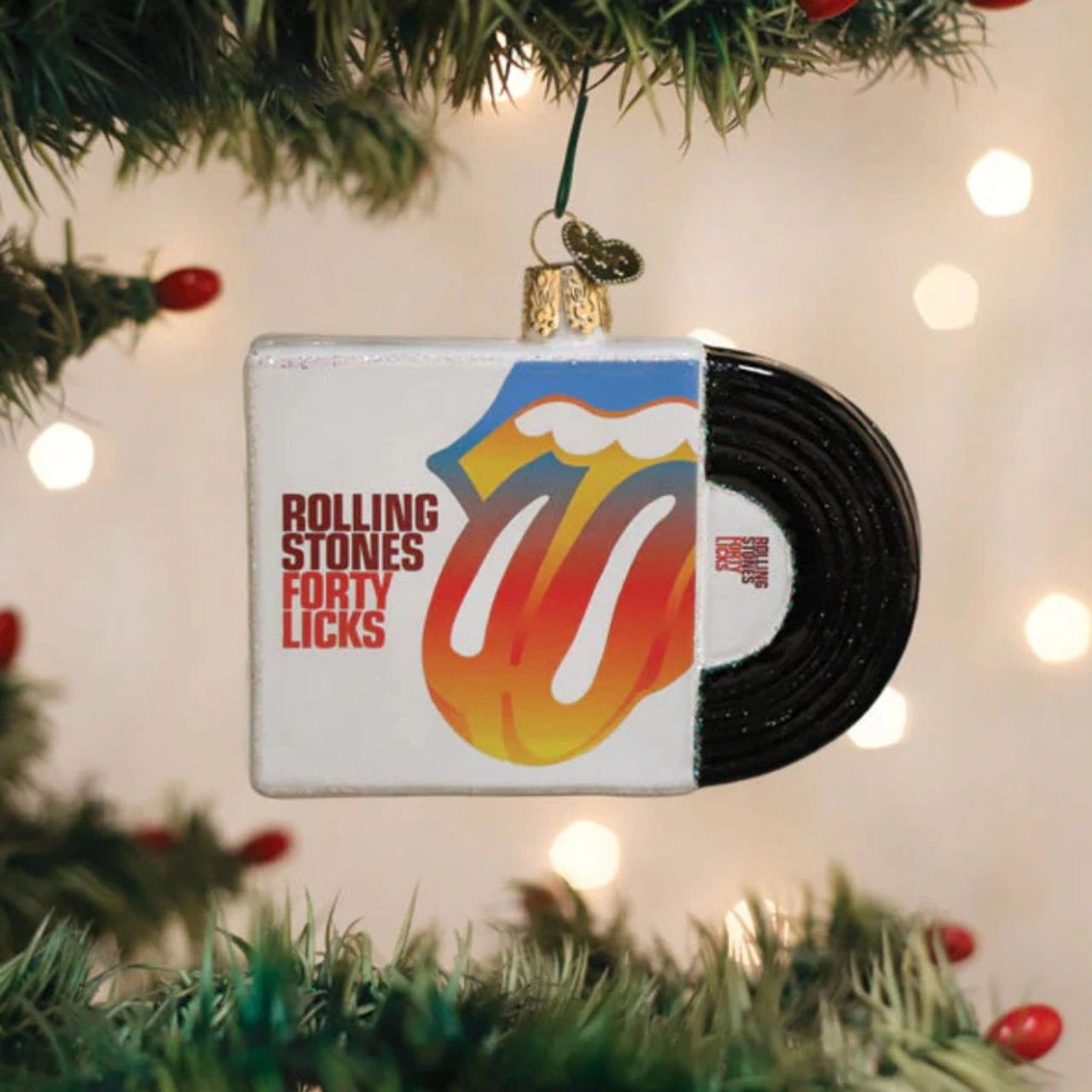 Rock your holiday decor with this Rolling Stones Forty Licks Album Ornament by Old World Christmas! Featuring the iconic tongue-and-lips logo and a mini vinyl record, this hand-blown glass ornament is a must-have for music lovers and collectors.