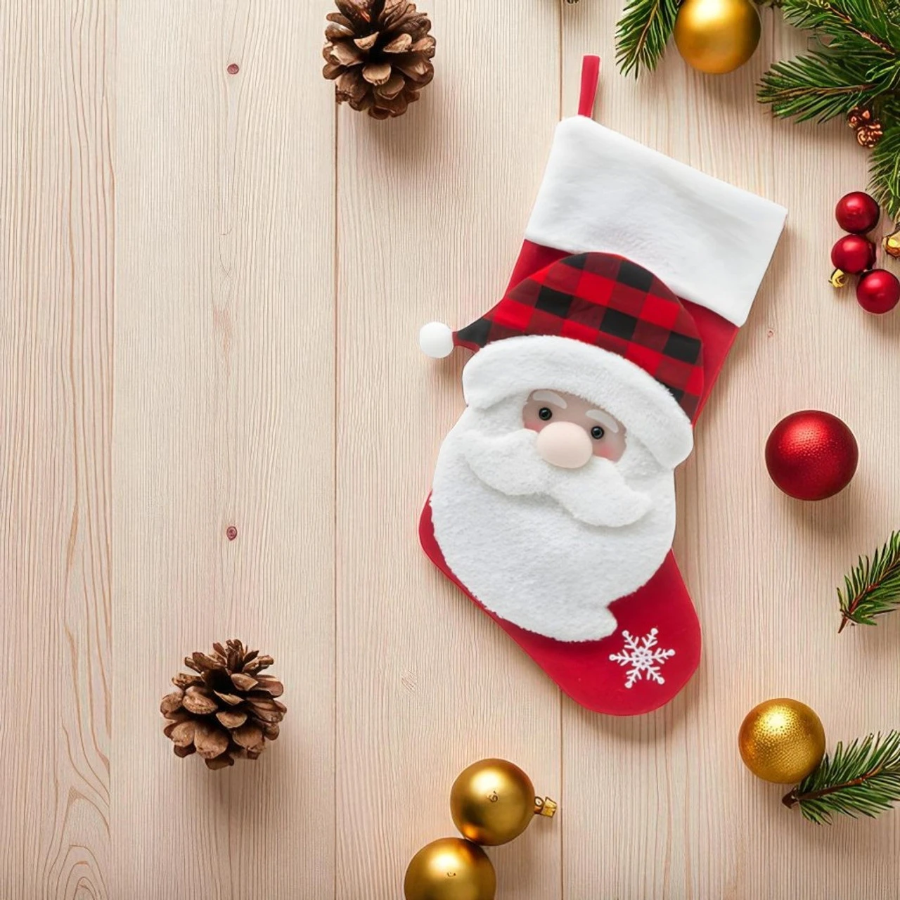Make your Christmas extra merry with this charming Santa Holiday Stocking! Measuring 18 inches long, it showcases Santa’s friendly face, complete with a soft white beard and a classic red-and-black plaid hat.