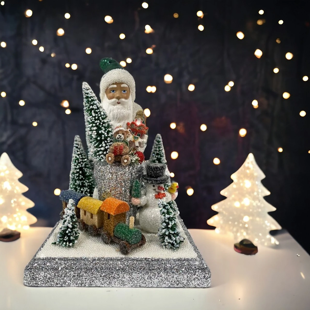 Celebrate the holidays with this charming Santa with Toys decoration from Schaller. This festive figure features Santa surrounded by toys, a snowman, and snowy trees.