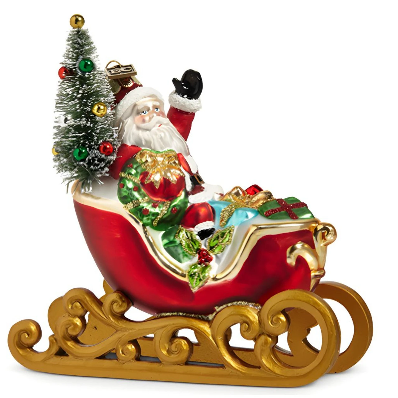 Experience the joy of the holiday season with this 5.25″ Sleigh Ride Ornament. Featuring Santa Claus cheerfully waving from his festive sleigh, packed with gifts and a decorated Christmas tree, this ornament captures the spirit of Christmas.