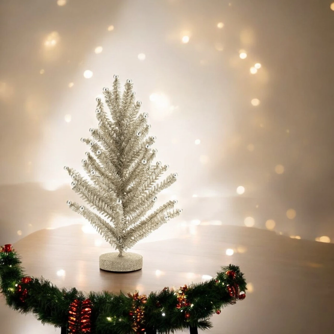 Add a touch of sparkle to your holiday decor with this Silver Mini Tree! Standing 14 inches tall, this charming tree is crafted from plastic and MDF, featuring shimmering white branches adorned with tiny silver baubles.