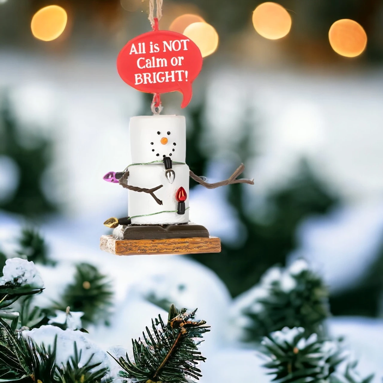 Shake up the holiday norms with the Smores “All is NOT Calm or Bright” Ornament. This quirky ornament showcases a marshmallow snowman humorously wrapped up in Christmas lights, making it a perfect piece for those who like a bit of chaos with their cheer.
