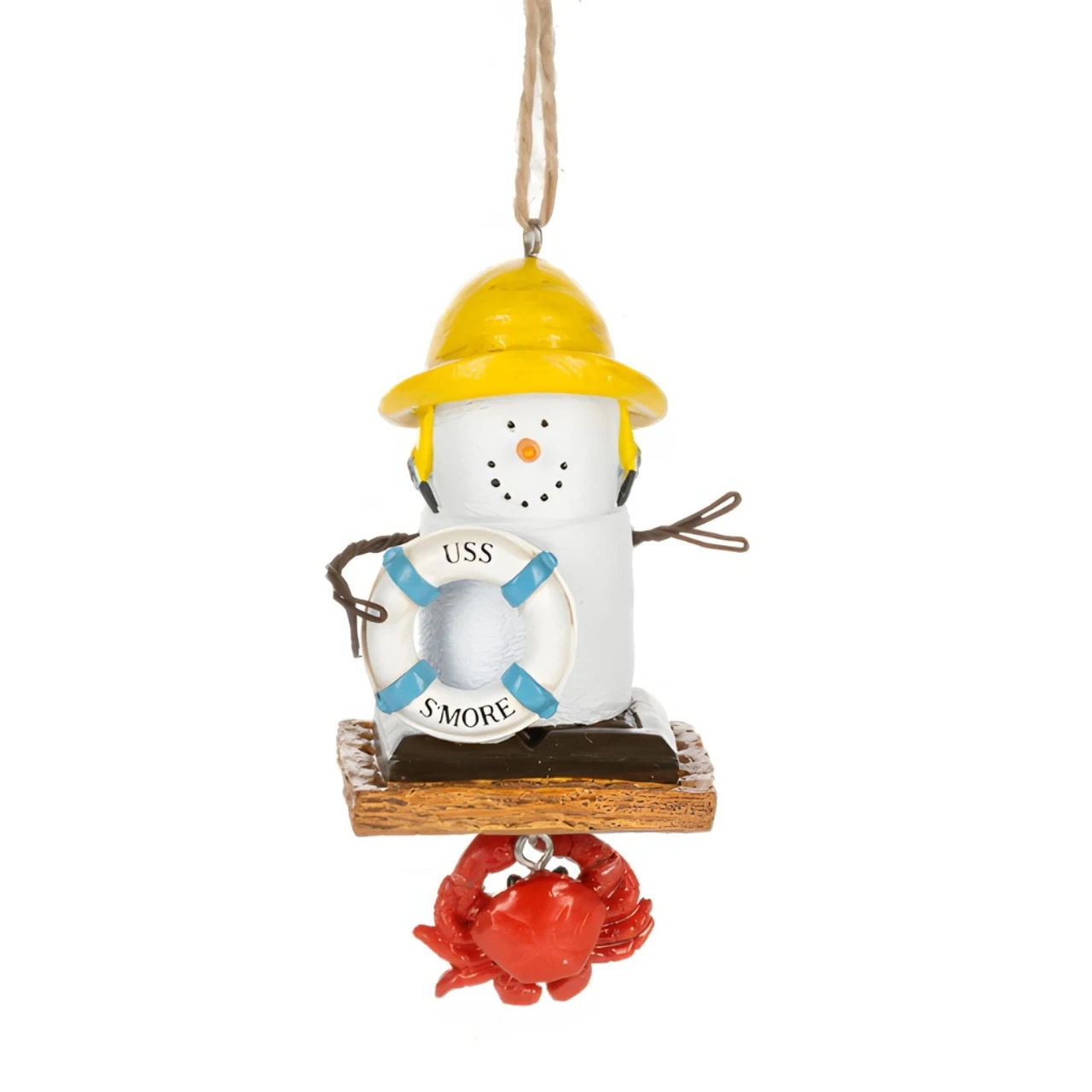 Bring seaside charm to your holiday tree with the Smores Coastal Crab Ornament! This maritime marshmallow wears a bright yellow fisherman’s hat and holds a life preserver labeled “USS S’more.” Dangling below is a playful red crab, adding a splash of coastal whimsy to your holiday decor.