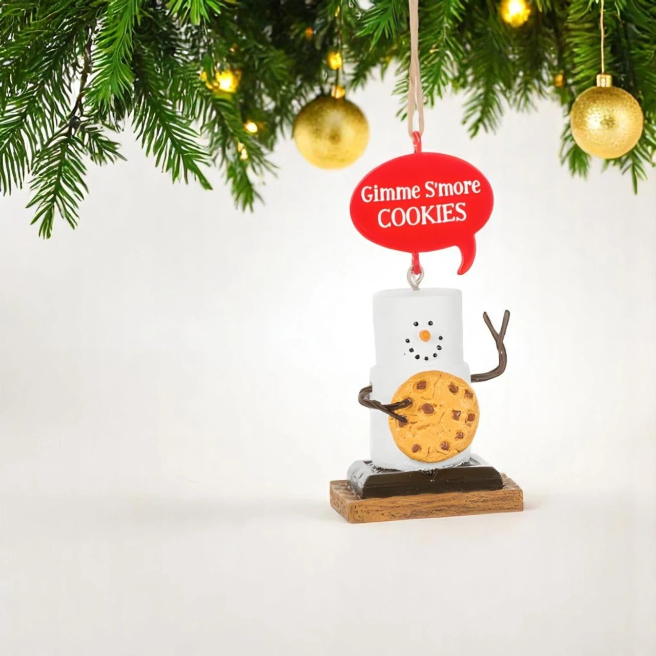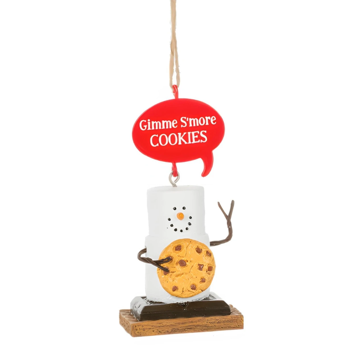 Satisfy your sweet tooth with the Smores Cookies Ornament! This cheerful marshmallow snowman is holding a giant chocolate chip cookie and proudly proclaiming, “Gimme S’more Cookies” from a red speech bubble overhead. With chocolate base and graham cracker bottom, this resin ornament is a must-have for cookie lovers and collectors alike.