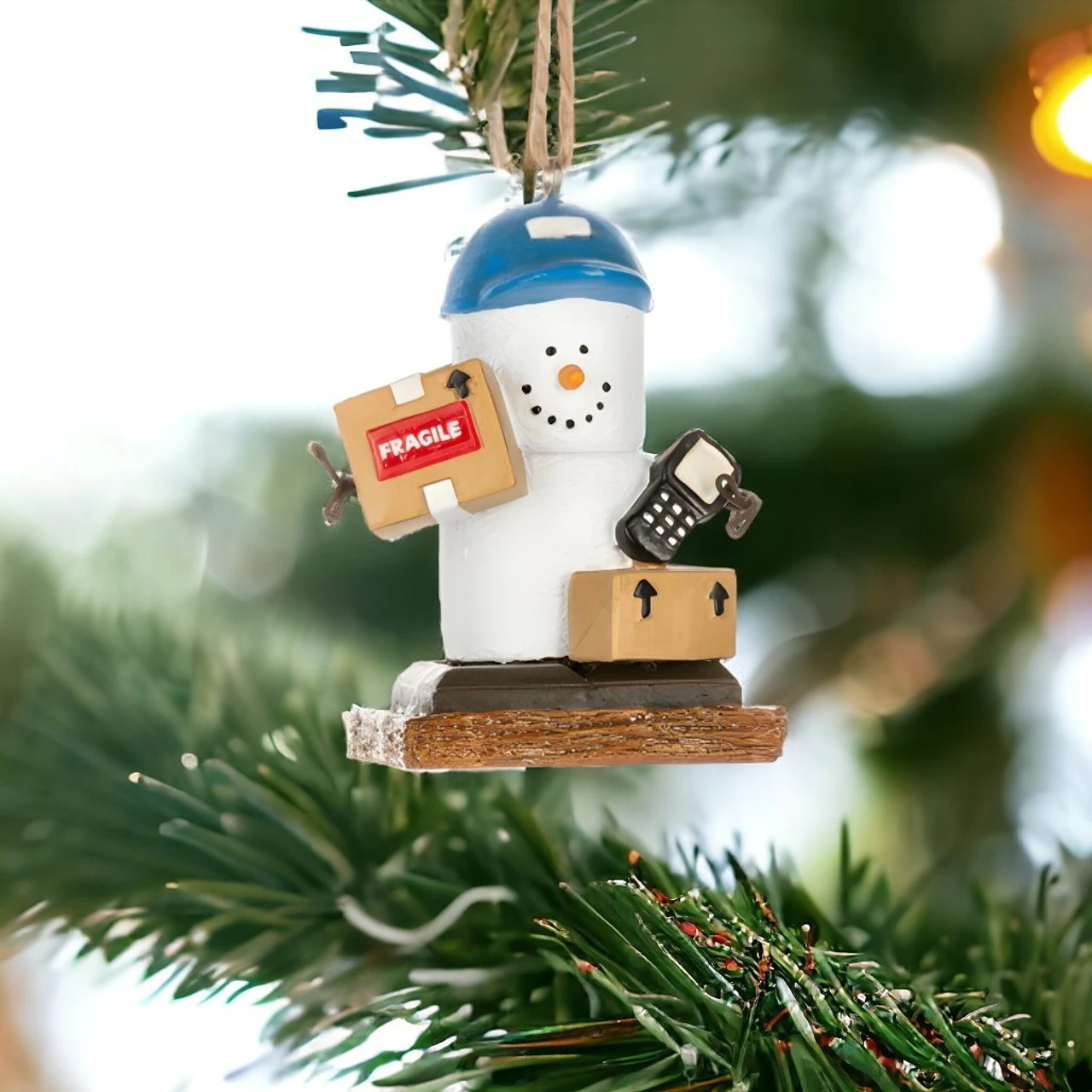 Add a touch of whimsy to your holiday decor with the Ganz Smores Delivery Driver Ornament. This charming ornament features a snowman delivery driver, complete with a fragile package and old-school cellphone.