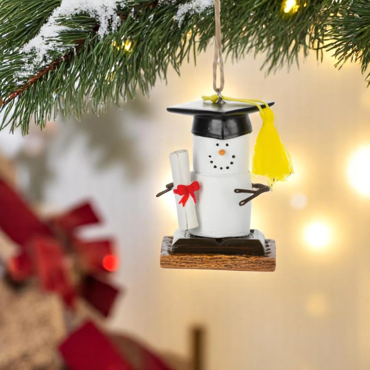 Celebrate their big achievement with a touch of sweet charm! The Smores Graduation Ornament features a marshmallow snowman proudly wearing a classic black cap with a yellow tassel and holding a diploma tied in a red ribbon.