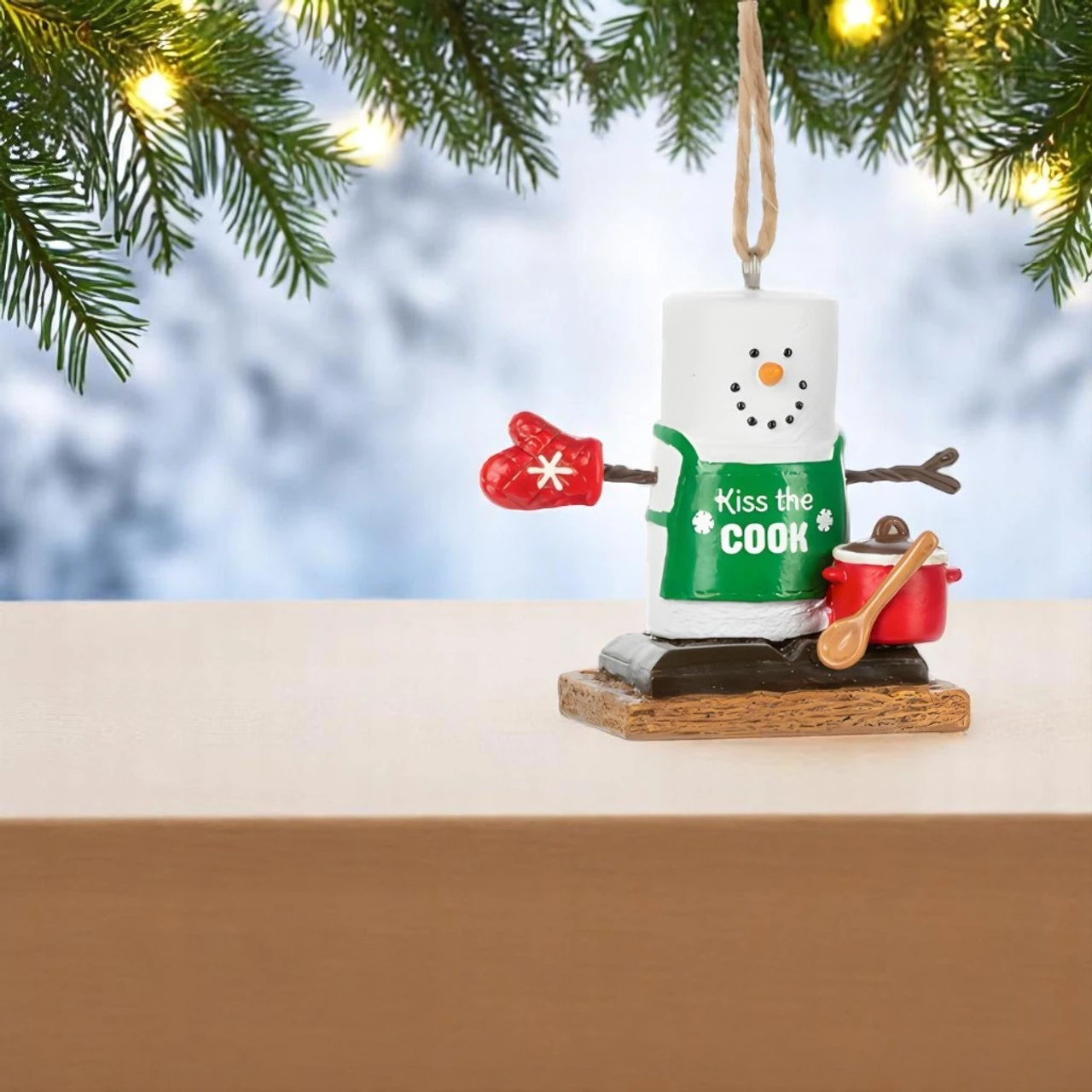 Spice up your tree with this Smores Kiss the Cook Ornament! This adorable marshmallow chef is dressed in a green apron that reads “Kiss the Cook” and comes with a red oven mitt, mini pot, and wooden spoon.