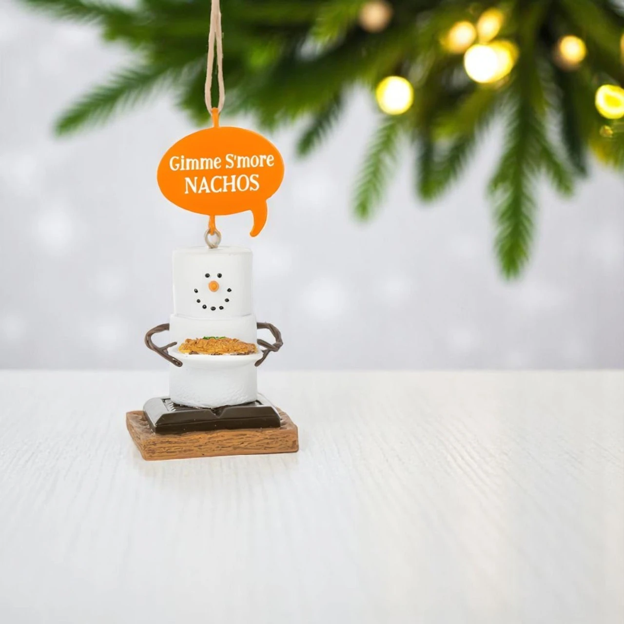 Turn up the flavor with this hilarious Smores Nacho Ornament! Featuring a marshmallow snowman holding a loaded plate of nachos, this festive foodie ornament says it all with a bright orange speech bubble: “Gimme S’more Nachos.”