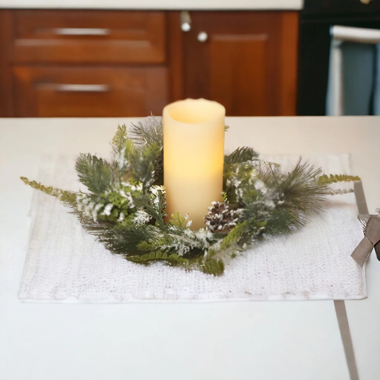Create a serene winter tablescape with our Snow-Kissed Flocked Pine & Pinecone Candle Ring. With its 12-inch diameter, it’s the perfect size to cradle a 4-inch candle, bringing a warm glow to frosty evenings.