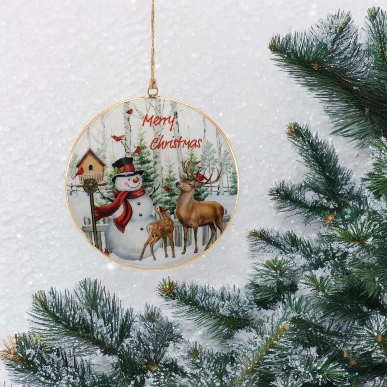 Bring a woodland winter wonderland to your holiday decor with this charming Snowman and Deer Disc Ornament. Measuring 6 inches tall and made from durable iron, this ornament features a heartwarming scene of a snowman, deer, and cardinals with a festive “Merry Christmas” message.