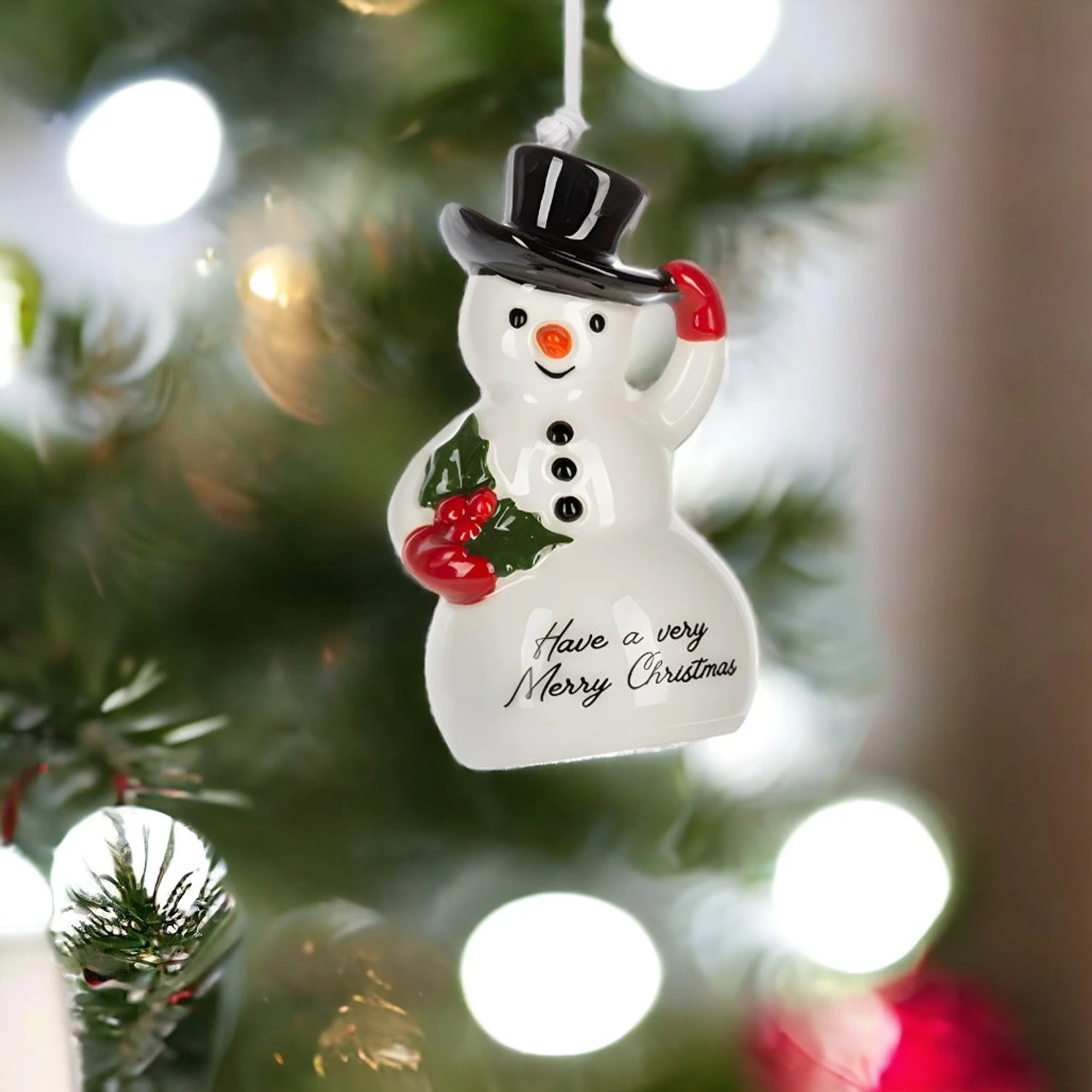 Celebrate the festive season with the charming Snowman Bell by Ganz. This delightful ornament features a glossy white snowman adorned with a classic black top hat and vibrant holly accents.