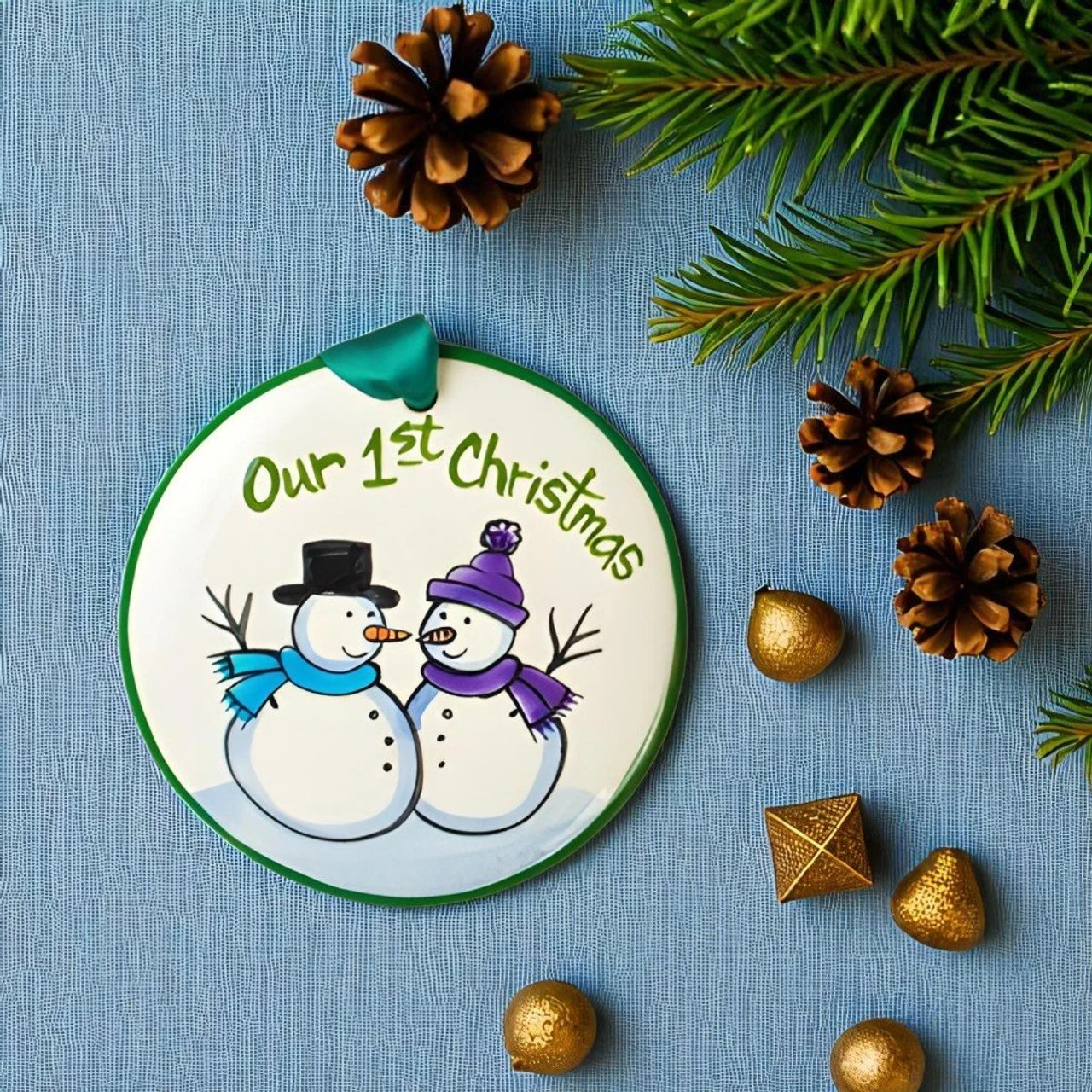 Celebrate your first holiday season together with the Nola Watkins Collection Our First Christmas Snow Couple Ornament. Hand-painted in Halifax, VA, this cheerful ceramic ornament features two snowmen bundled in colorful scarves and hats, capturing the magic of new traditions.
