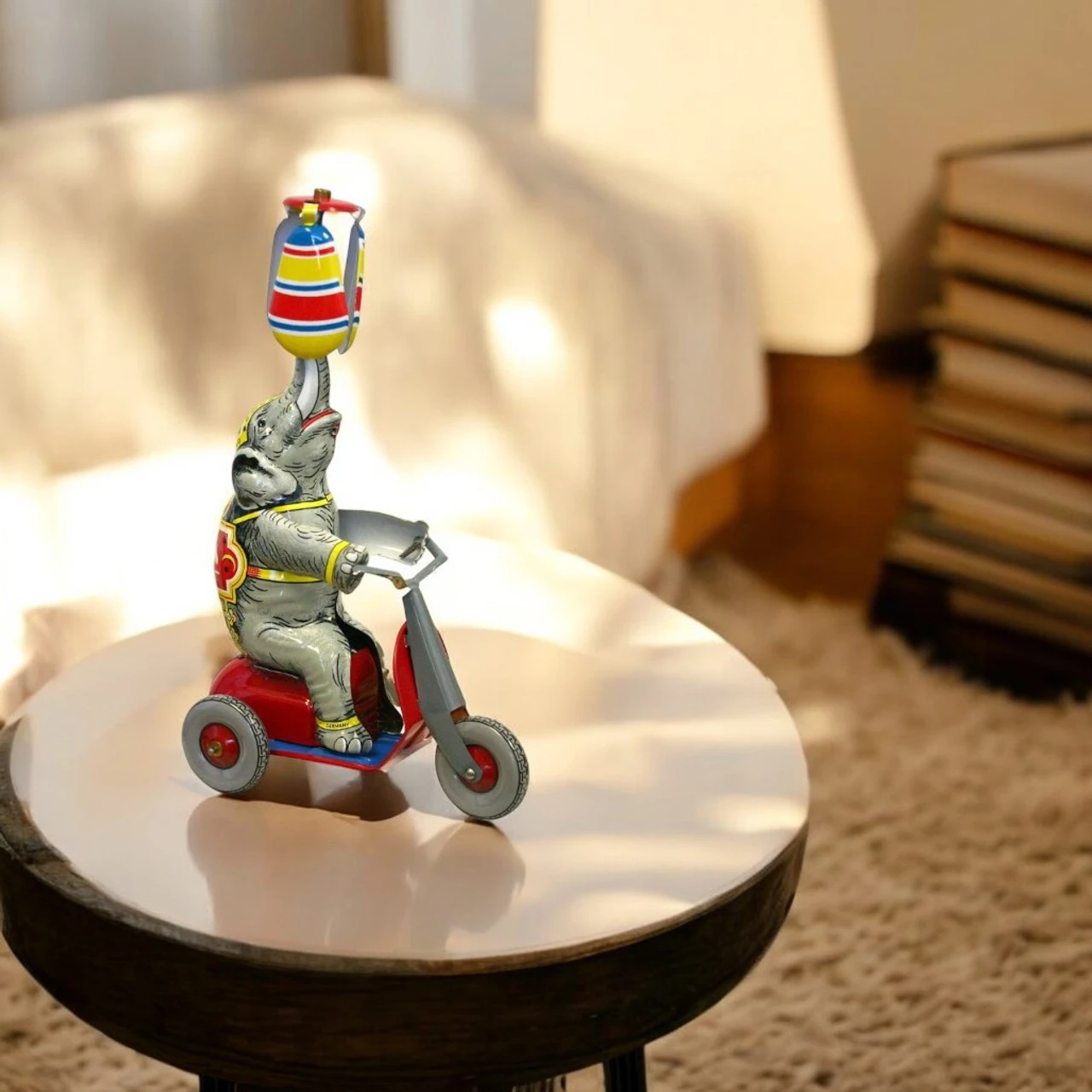 Step right up and enjoy the charm of classic tin toys with this German Collectible Tin Toy – Elephant on Scooter! This delightful wind-up circus elephant rides along on a scooter while skillfully balancing colorful spinning propellers on its trunk. Crafted in Germany with intricate details and vibrant colors, this nostalgic piece is perfect for collectors and vintage toy lovers. A fun conversation starter, this tin toy brings a playful spirit to any collection!