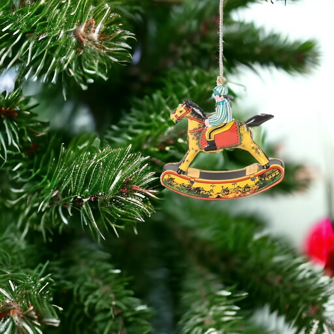 Celebrate a classic Christmas with the Alexander Taron Vintage Tin Rocking Horse Ornament. This charming piece features a brightly colored rider on a vibrant rocking horse.