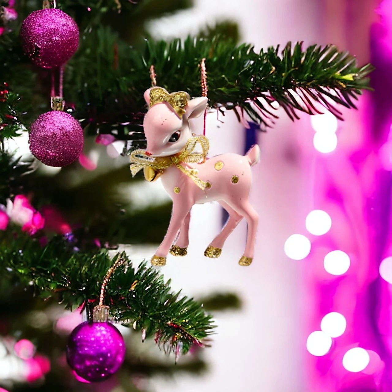 Add a touch of whimsy to your holiday decor with this Vintage Pink Deer ornament. Featuring a charming pink deer with its head down, adorned with a gold bow and bell, this ornament is a delightful addition to your Christmas tree.
